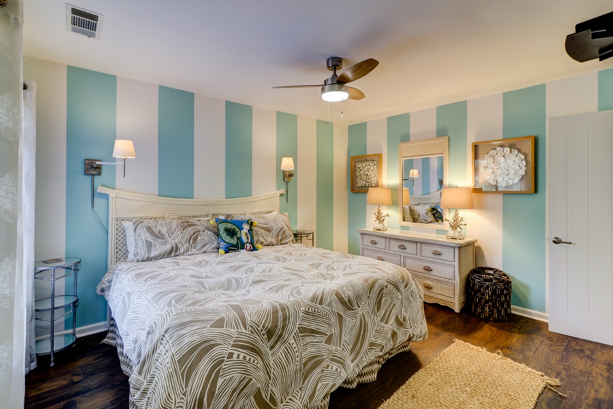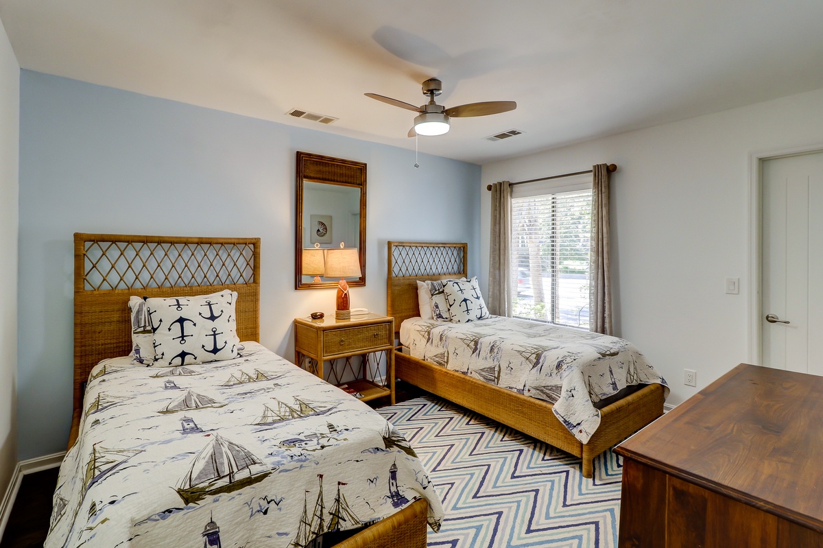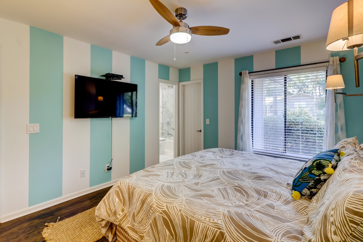 The home’s guest rooms evoke the color and vibe of the Lowcountry, starting with a Caribbean-inspired room near the front of the home with two twin beds and access to a full bath with walk-in shower. Another room nearby pairs teal and cream stripes around a king bed with a flat-screen TV and en suite bath with tub and shower.