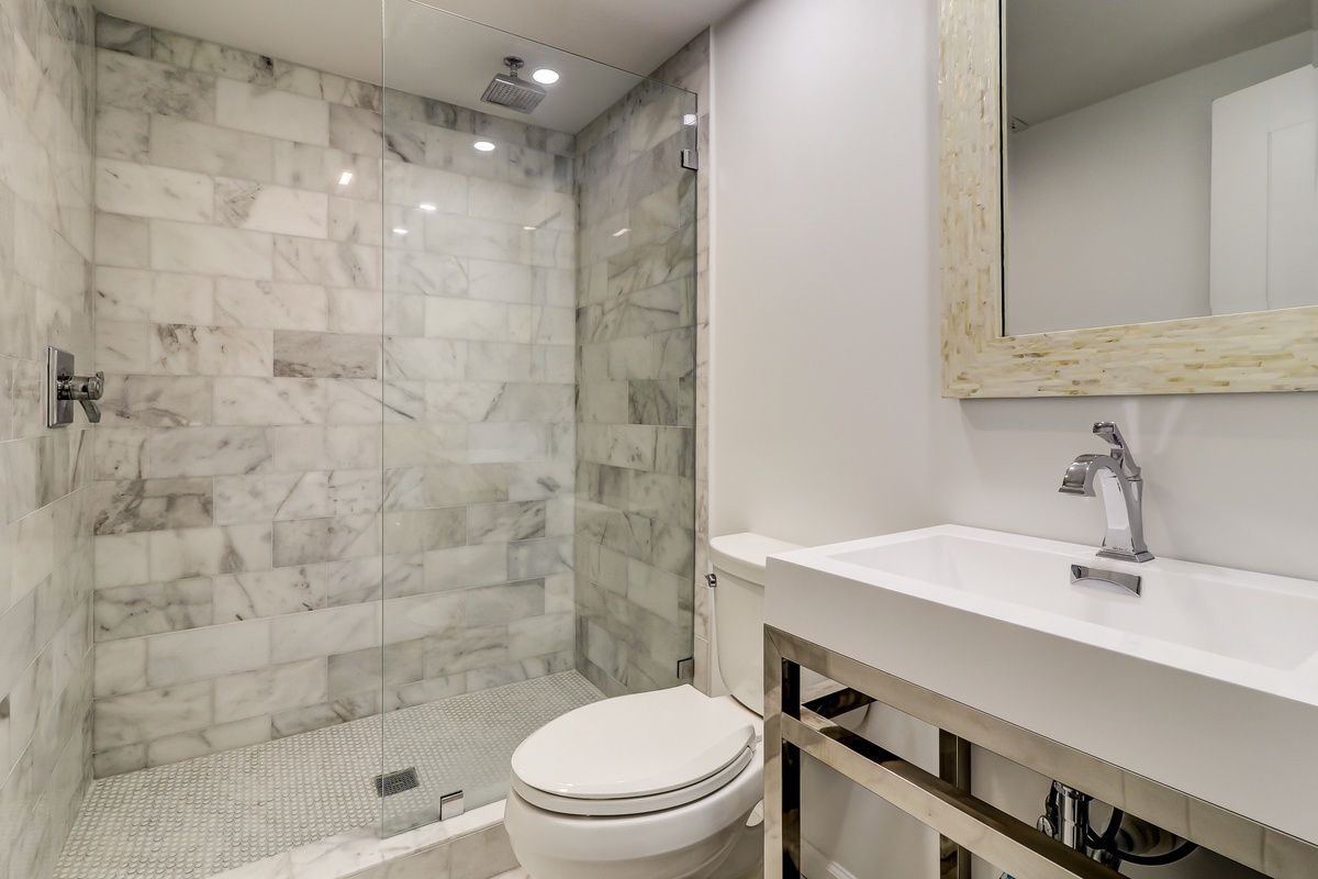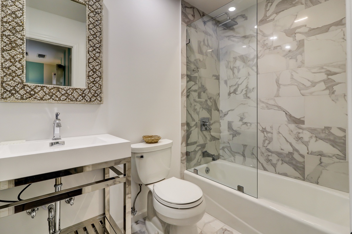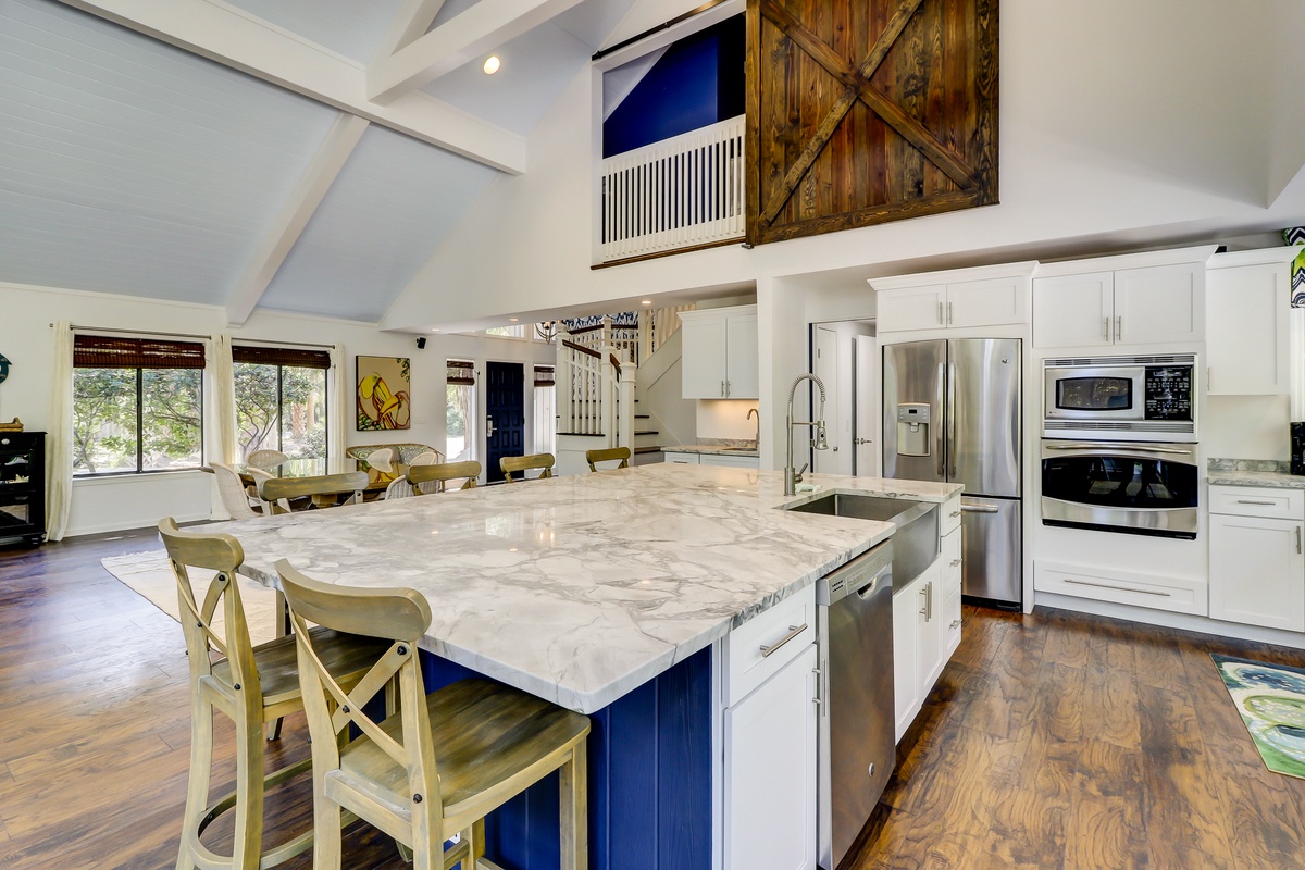 At the heart of the home is that majestically spacious open living area. Dominated on one side by a towering fireplace that stretches toward soaring ceilings and skylights, this space was built for large gatherings. Dual sofas and dual armchairs front a large flat-screen TV above the decorative fireplace, while a nearby glass-topped table offers dining for six. One corner of this massive space is given over to the wonderfully updated kitchen, marked by a massive center island of marbled stone with bar seating for six. Amid modern cabinets you’ll find a full suite of stainless-steel appliances as well as a nearby wet bar for entertaining.