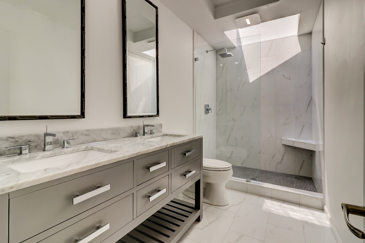 The master suite indulges with a rich sense of space through vaulted ceilings, with coastal chic décor surrounding a king-size bed. The master suite enjoys private access to the rear patio, as well as a spacious en suite bath with a dual basin vanity and spacious walk-in shower topped by a skylight.