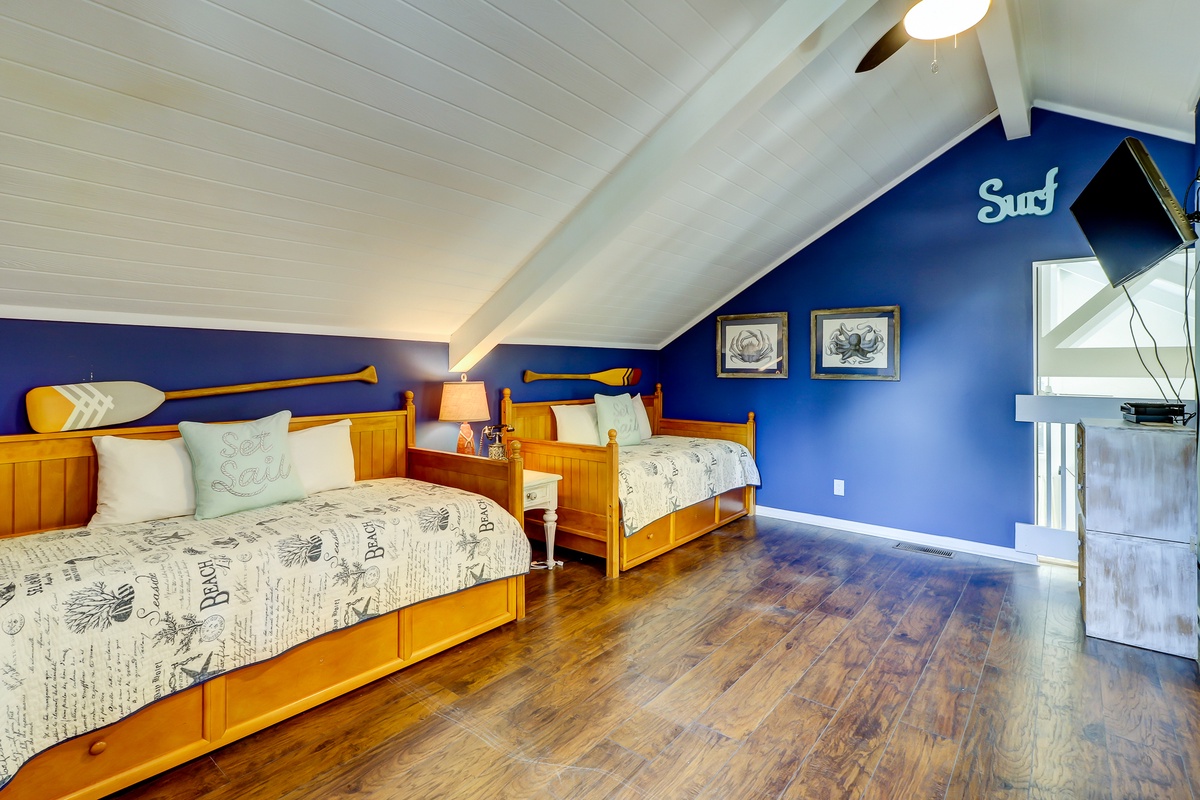 Head upstairs, and you’ll find a vibrant room perfect for younger guests, with dual twin trundle beds, flat-screen TV, private bath with walk-in shower and railed balcony looking out through a massive barn door down onto the main living space.