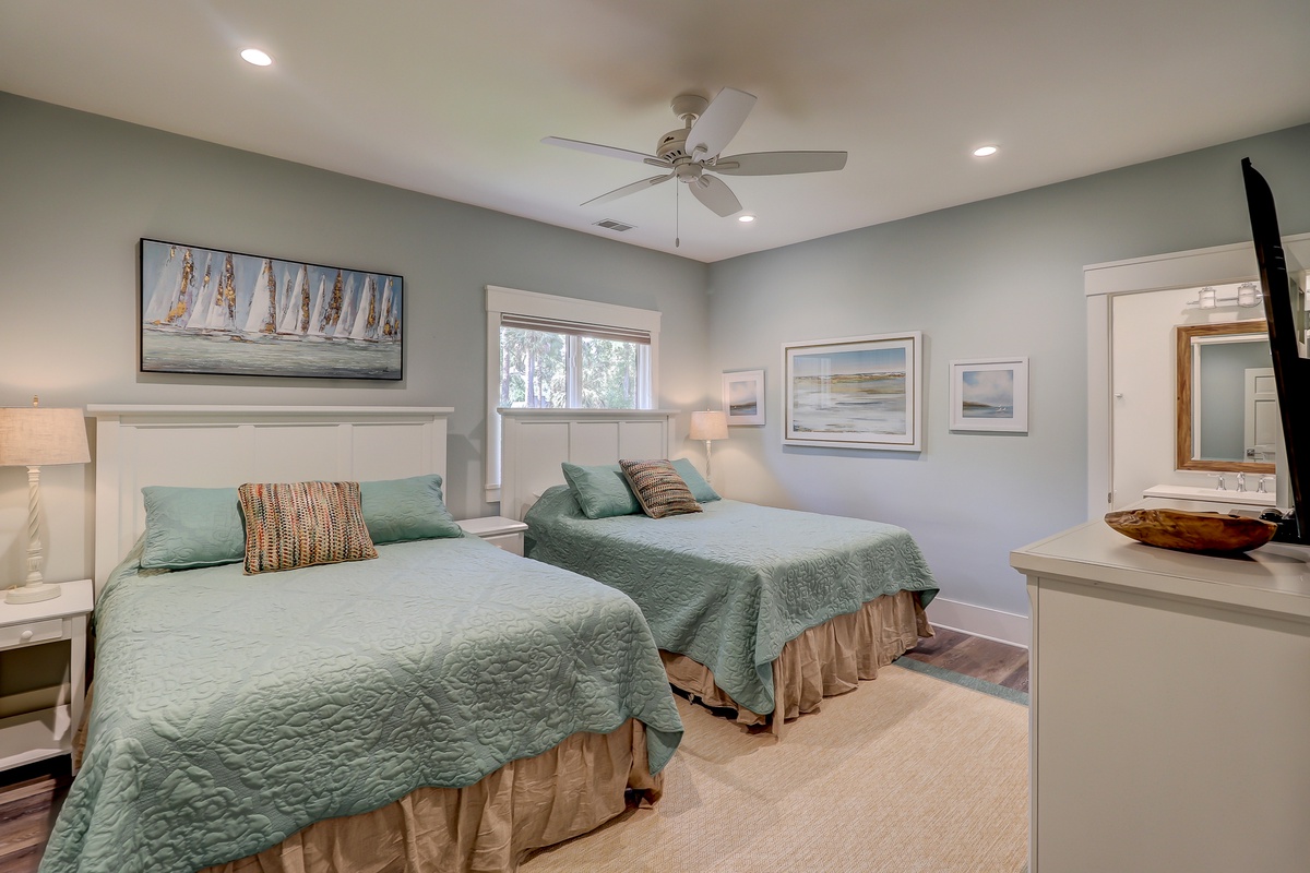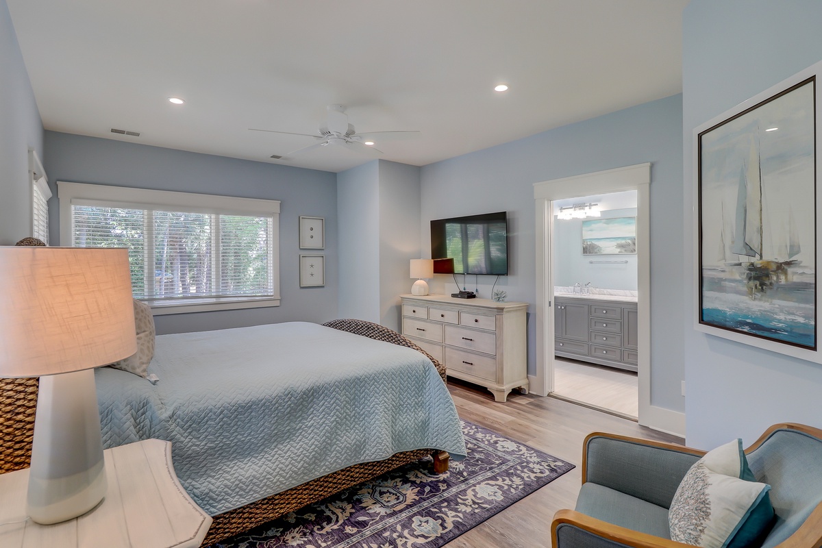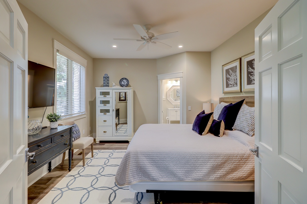 The Lowcountry charm and luxury continue throughout the property’s exquisite five-star bedrooms. The first, set off of the main living space, offers a king-size bed in a suite with ceiling fan, flat-screen TV and en suite with walk-in shower.