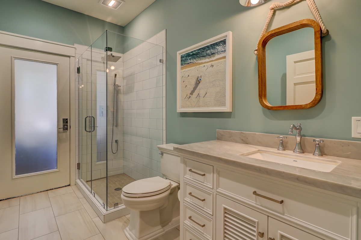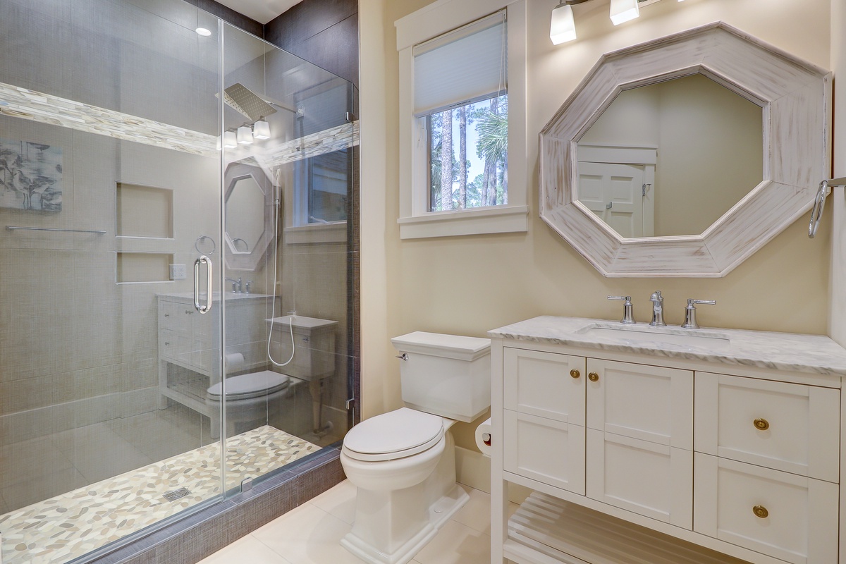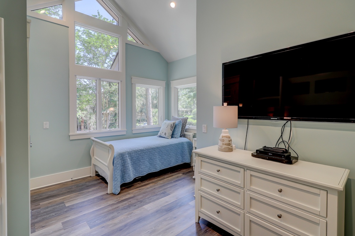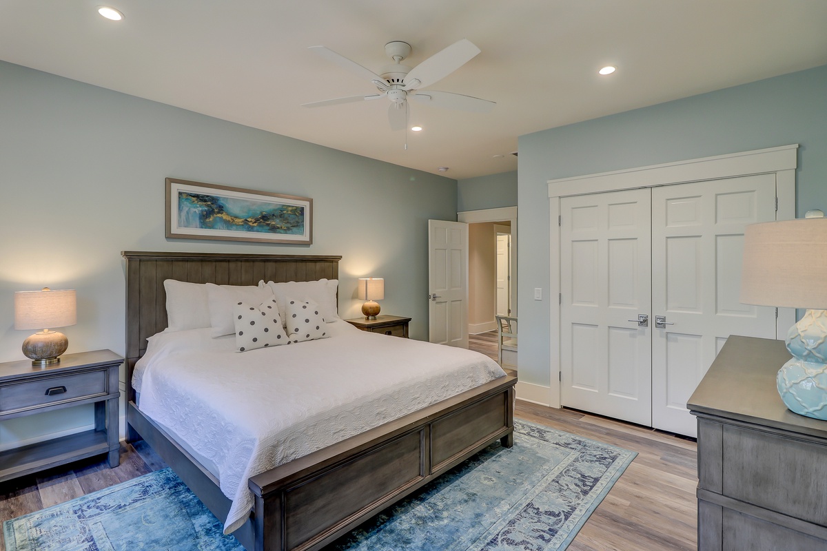 The Lowcountry charm and luxury continue throughout the property’s exquisite five-star bedrooms. The first, set off of the main living space, offers a king-size bed in a suite with ceiling fan, flat-screen TV and en suite with walk-in shower.
