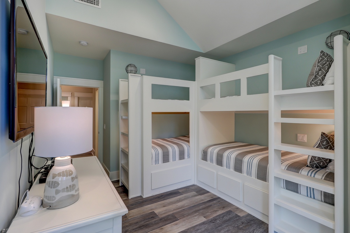 The remaining stairs give way to a cozy private upstairs living space, marked by a flat-screen TV, gaming table, private balcony and entertaining area with wine cooler, sink and coffee maker. This space serves three bedrooms, each with its own unique style and comfort. One bedrooms offers a king-size bed, ceiling fan and en suite with spacious walk-in shower. The second bedroom has 2 queen sized beds and an ensuite walk in shower. The third is ideal for younger guests ready to make sleepover memories, with four built-in bunk beds and a separate twin bed with trundle, set beneath vaulted ceilings.