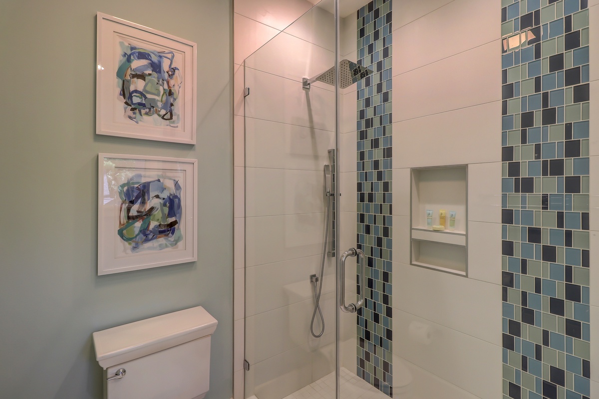 The remaining bedrooms can be found up a set of stairs, just past a stylishly modern full bath with walk-in shower, as well as a separate washer and dryer concealed behind farmhouse door.
