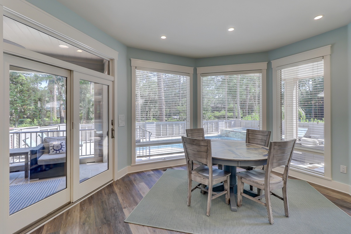 A small breakfast nook with seating for four to one side and a grand formal dining area with seating for six anchor either side of the main living space, while a wall of tall windows and glass doors bathe the space in natural light while providing a view of the luxurious outdoor space. Step outside and you’re in an outdoor oasis marked by glittering swimming pool with splash-down spa, built-in four burner grill and separate outdoor roofed conversation area.