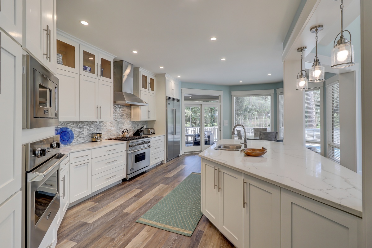 The coastal chic brilliance of this home fills a vast open living space with rustic charm and authentic materials from shiplap to reclaimed wood. Set beneath soaring vaulted ceilings with exposed beams, the main living area exudes comfort with its decorative fireplace, plus plush sectional sofas and armchairs set before a large flat-screen TV. Just beyond a wide center island of marbled granite with bar seating for four, the gourmet chef’s kitchen delights with top-of-the-line appliances and updated custom cabinetry.