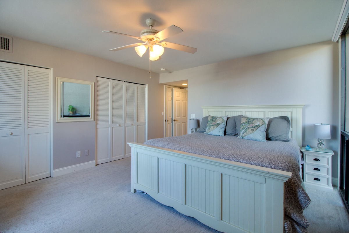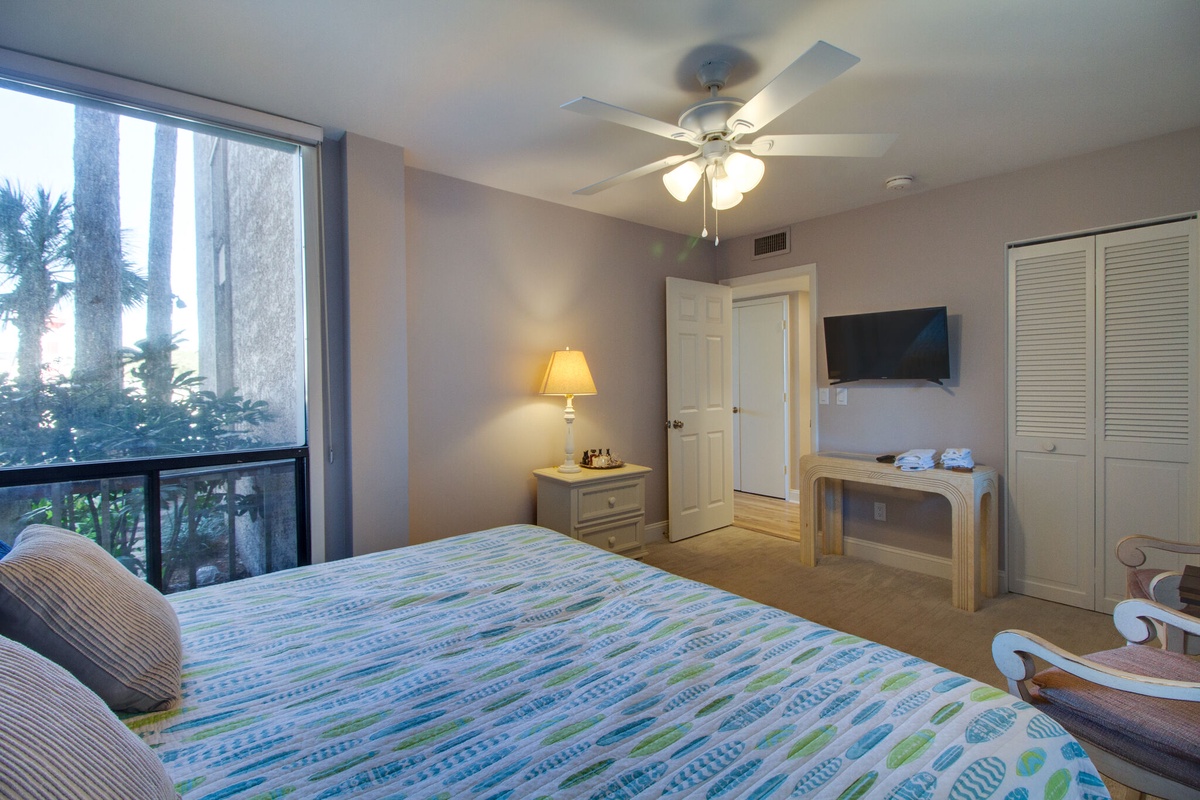 This graceful room further showcases the harbor view beyond its sliding glass door, opening to a large patio with both a high-top dining table and cocktail table- perfect spots to enjoy morning coffee, evening dining and sunsets. A baker’s rack tucked into the corner offers serving space to host a delicious meal or an elegant cocktail party. Enjoy the patio into the evening with a lighted ceiling fan.