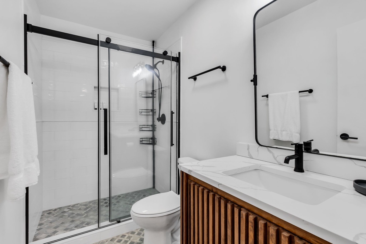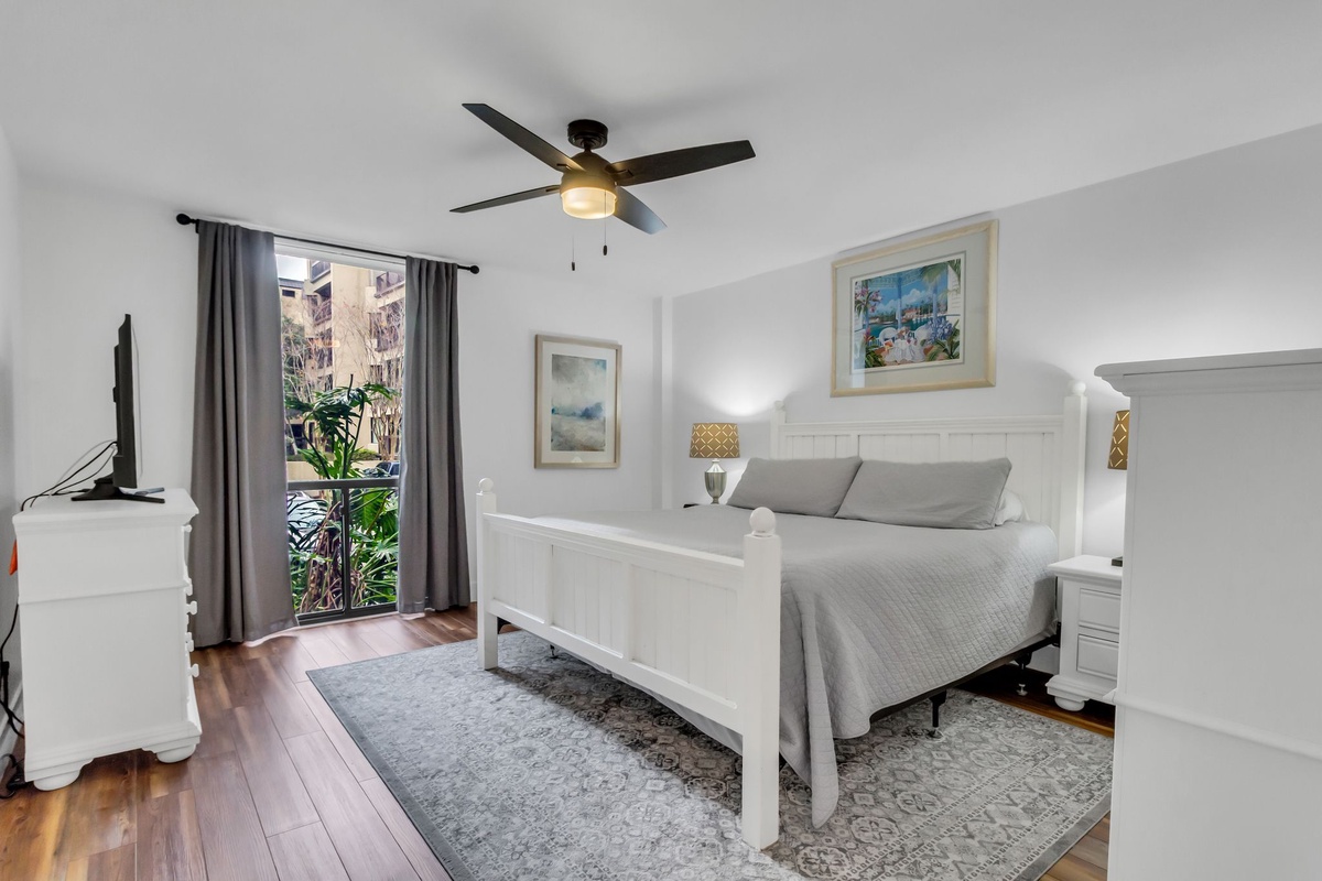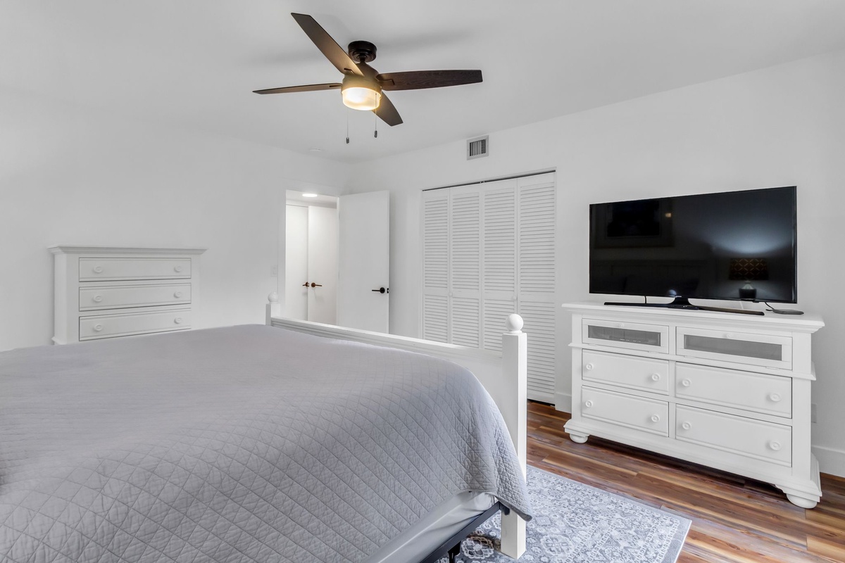 The primary bedroom basks in spaciousness, with a king-size bed at the center as well as a ceiling fan, flat-screen TV and floor-to-ceiling windows. This room enjoys access to a wonderfully updated bathroom with walk-in shower.