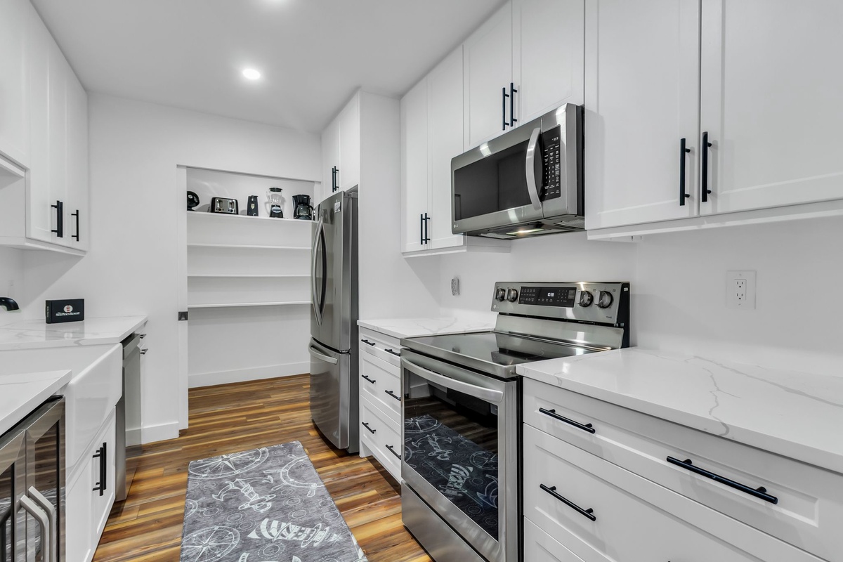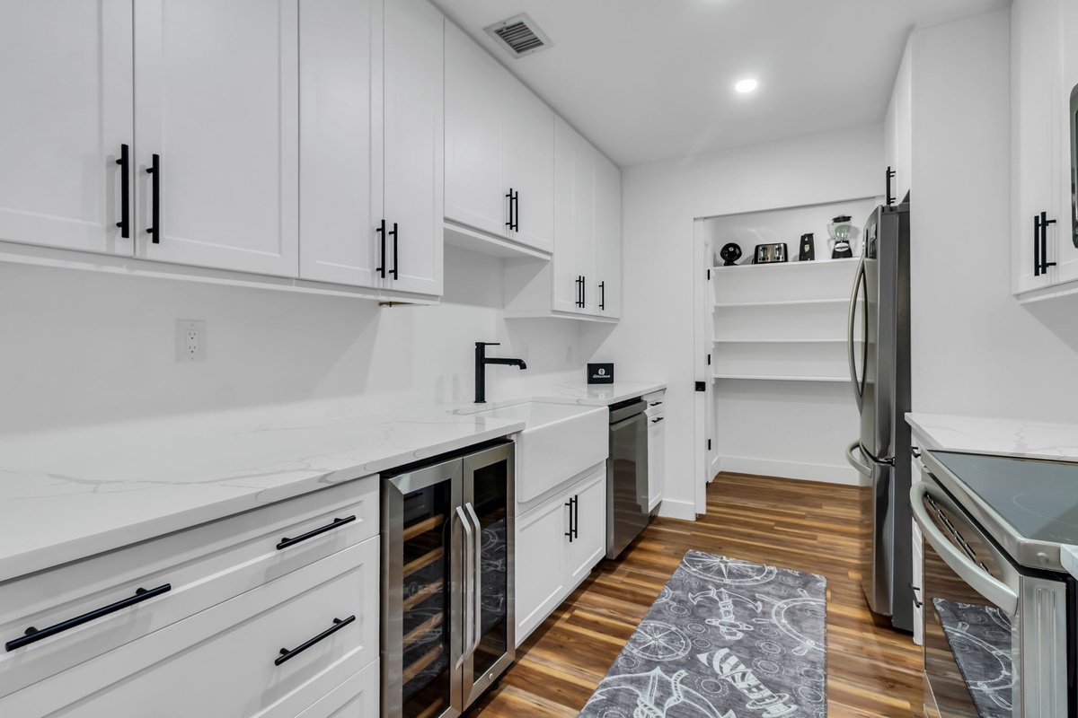 At the far end of the great room, dining for four transitions to the galley-style kitchen whose white marbled counters run between updated appliances including flat cooktop stove, French door refrigerator and separate wine cooler.