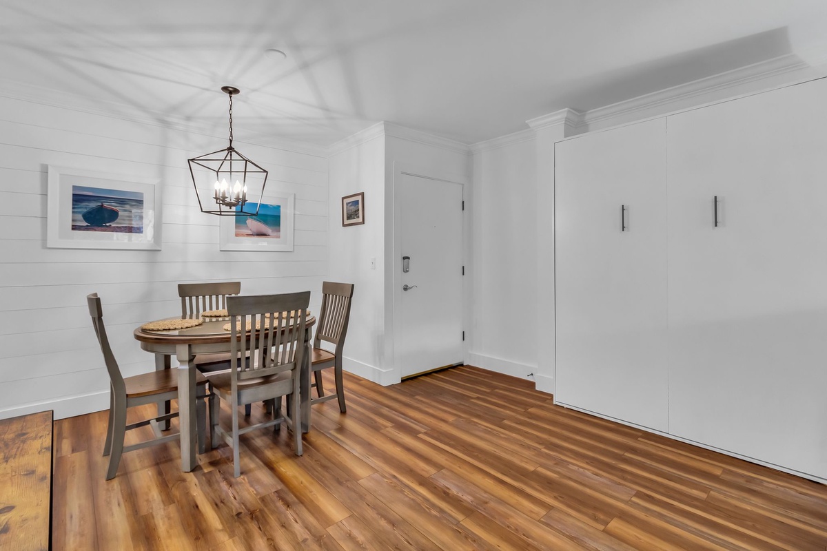 Luxury vinyl plank flooring runs throughout the villa, stretching from the great room into the expansive primary bedroom. In the great room, it informs the elegant atmosphere of a space that boasts a wide sectional sofa facing a flat-screen TV as well as a concealed murphy bed. Sliders beyond open to an intimate patio for two gazing out over lush greenery.