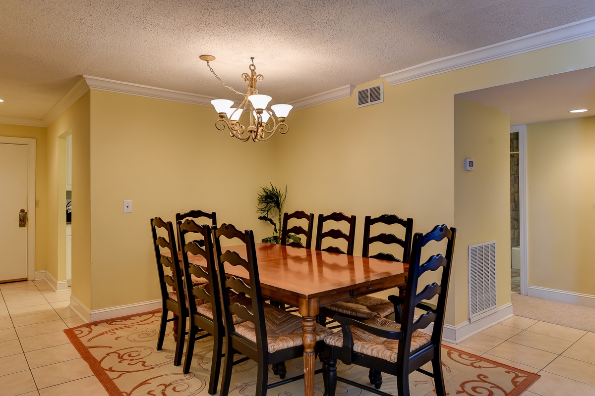 In this open floor plan, the dining room seats eight fashionably, with the nearby kitchen which features granite countertops, a flat cooktop and tile flooring. Every detail is thoughtfully considered in this one-of-a-kind villa.