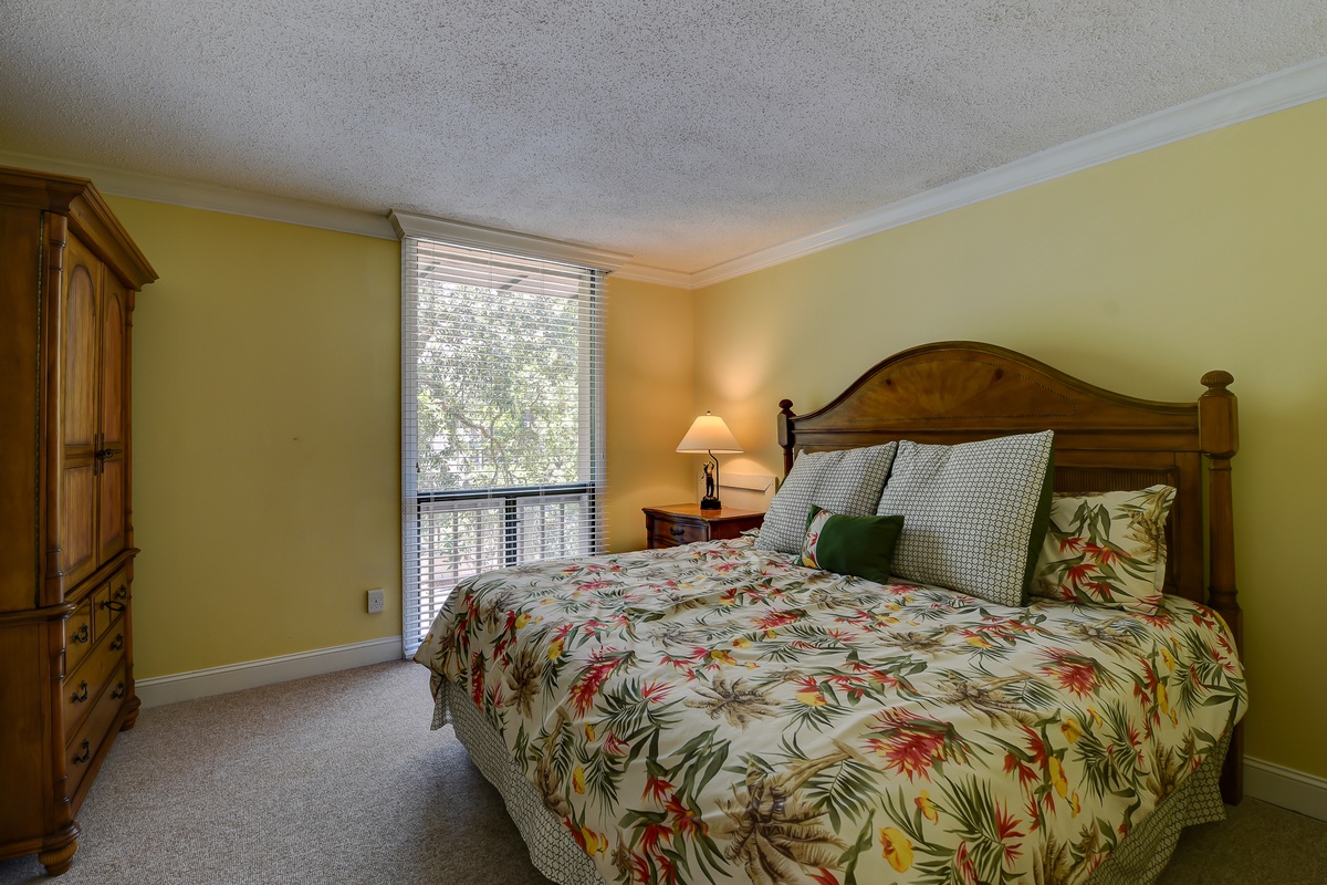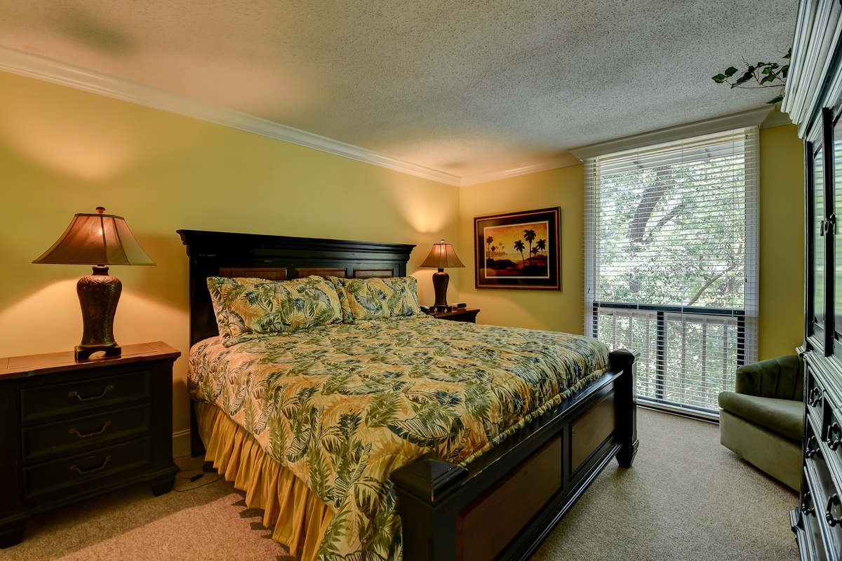 Outfitted gracefully with a palm motif, another bedroom also features a king-sized bed, TV and private bath with granite vanity and tub/shower.