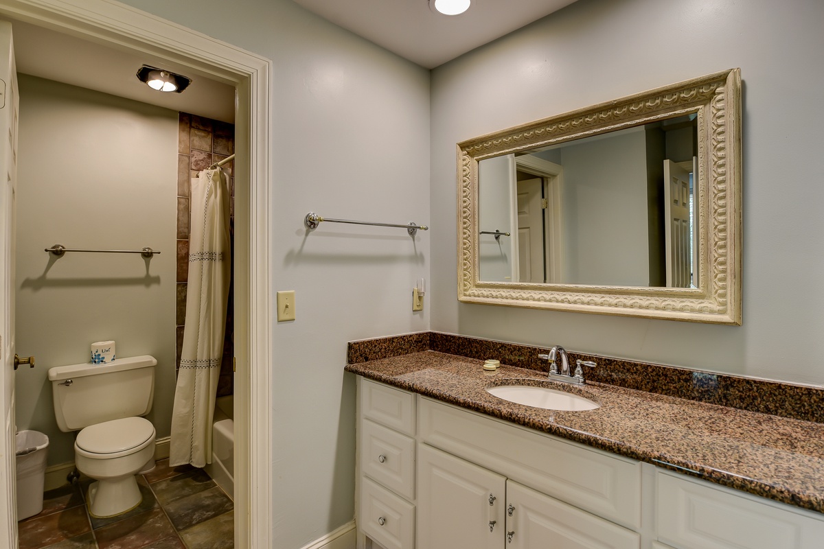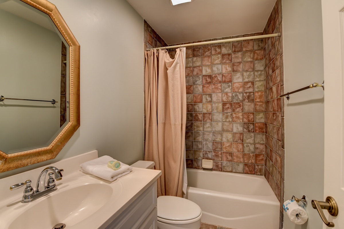 The third bedroom houses cheerfully-adorned twin beds in a nautical theme, featuring a bathroom with slate flooring and a combination tub/shower.