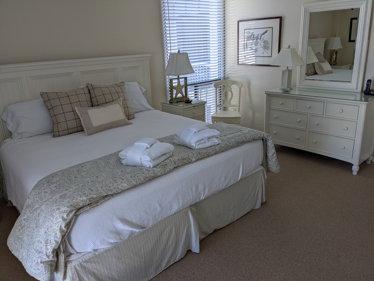 In a calming neutral palette, the bedroom showcases a king-sized bed, TV, DVR, internet access, and his-and-her closets….all overlooking the dazzling harbour vista. The master bath holds a wide vanity, stone flooring and tub/shower combination; and there’s a second, neighboring bedroom with two twins and bathroom with mirroring features.
