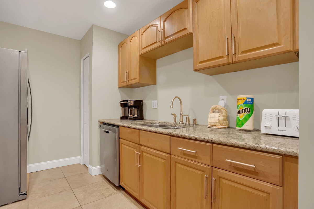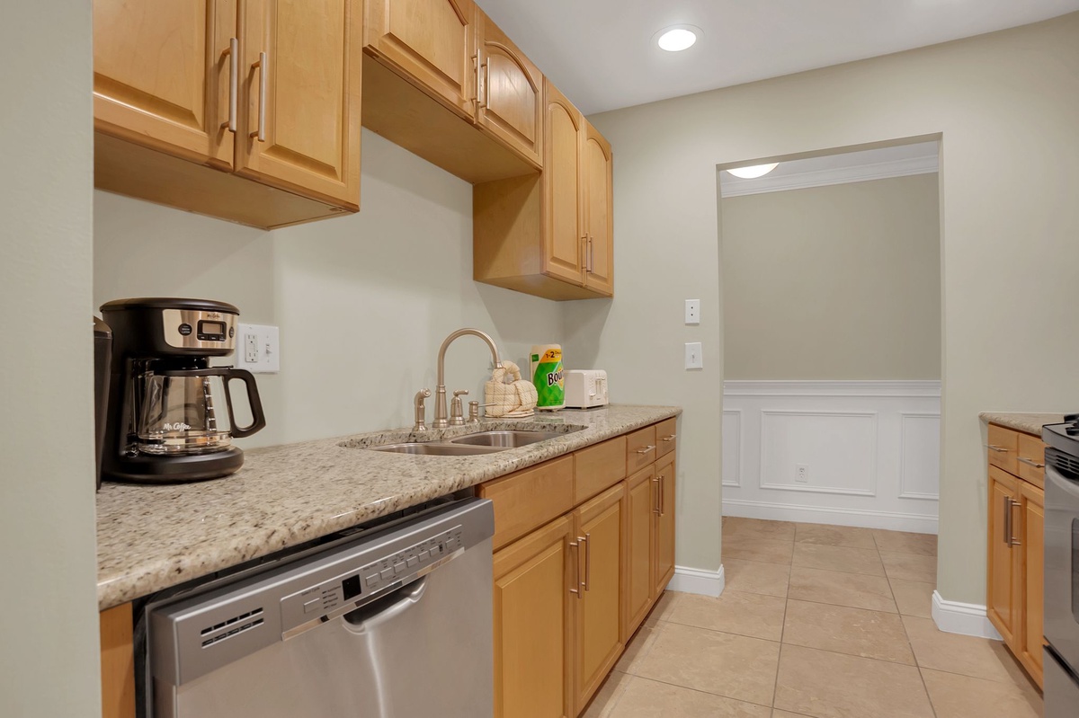 Offering saturnia flooring and a streamlined design, the completely renovated kitchen features taupe and tan granite countertops, stainless steel appliances and a mirrored backsplash.