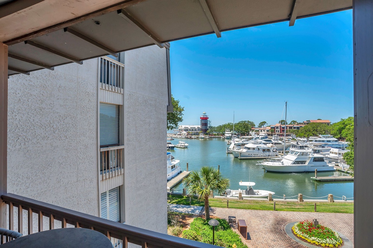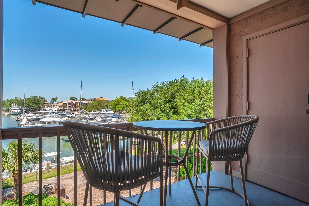 The corner of the living area features a 52 inch flat screen TV plus DVD and VCR. Sliding glass doors open to reveal the pièce de résistance of this villa: the breathtaking views of the Harbour Town Yacht Basin. Seating on this private patio, with ceiling fan, affords you a spectacular vantage point for watching the evening sunsets that melt into the Calibogue Sound.