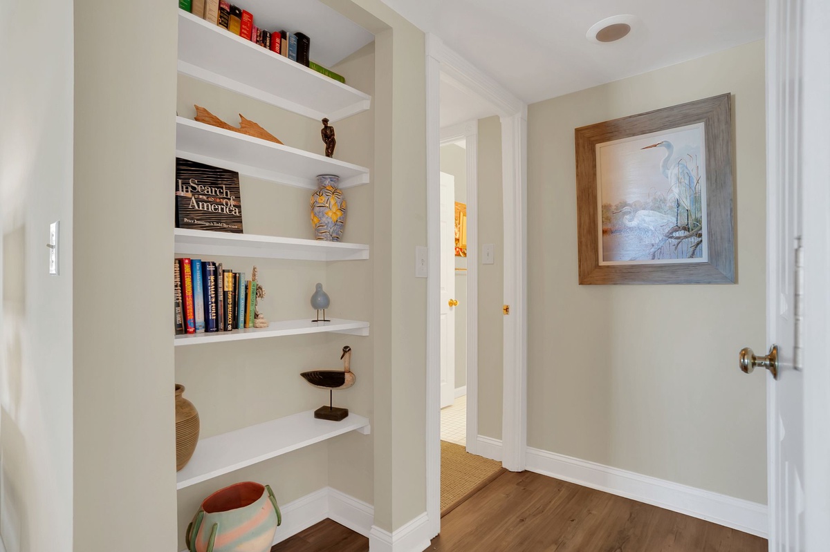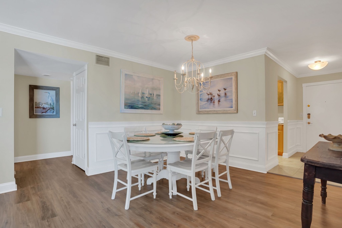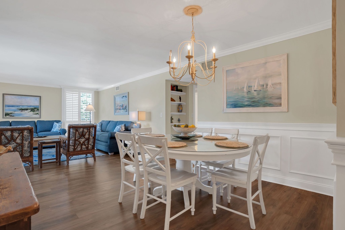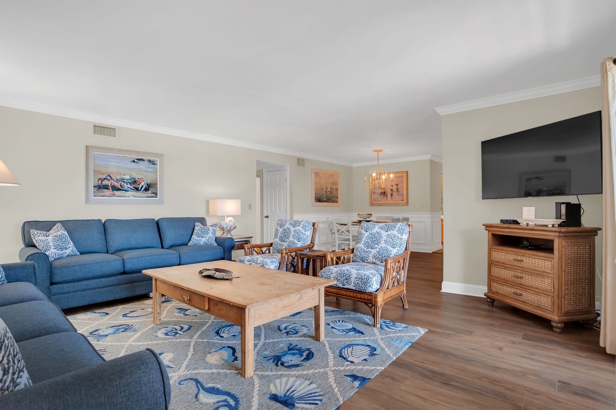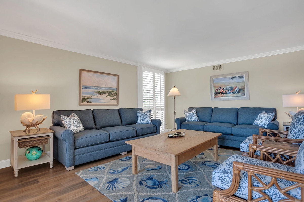 The combination living room/dining room is awash in coastal hues of sea and sand, showcasing two generous espresso-toned sofas. Attentive touches are evident throughout, including plantation shutters, new berber flooring and relaxed elegant seating, all with a welcoming seaside vibe.