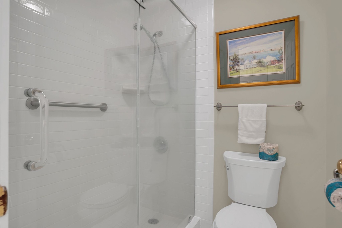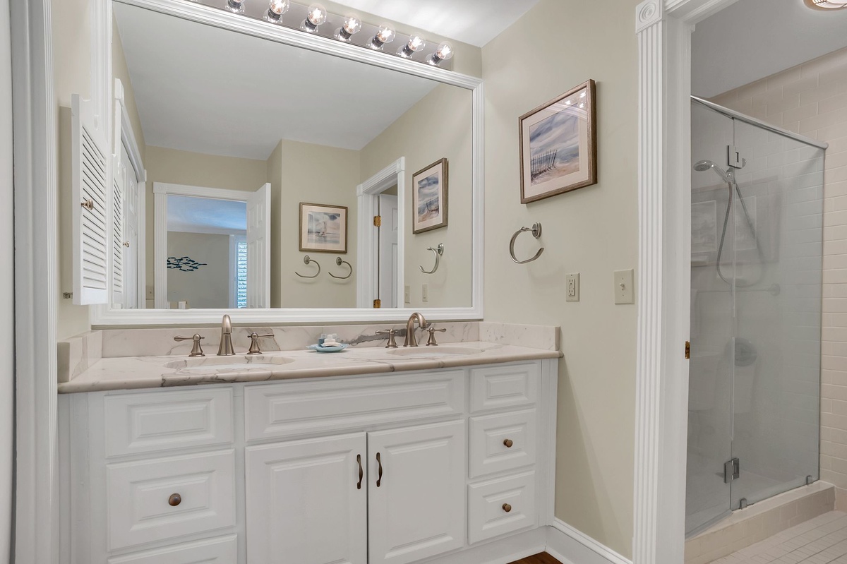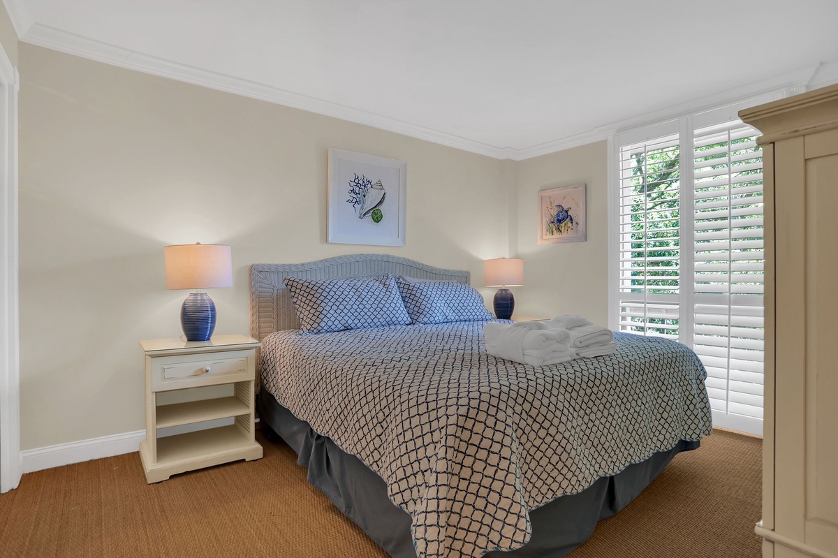 A guest bedroom, which also could be considered a second master, features a king-sized bed with a soft seaside palette. This room holds a TV and DVD player as well as plantation shutters plus two closets. Its fully appointed bathroom features a wide, marble-topped double vanity with brushed nickel fixtures and a spacious glass door shower.