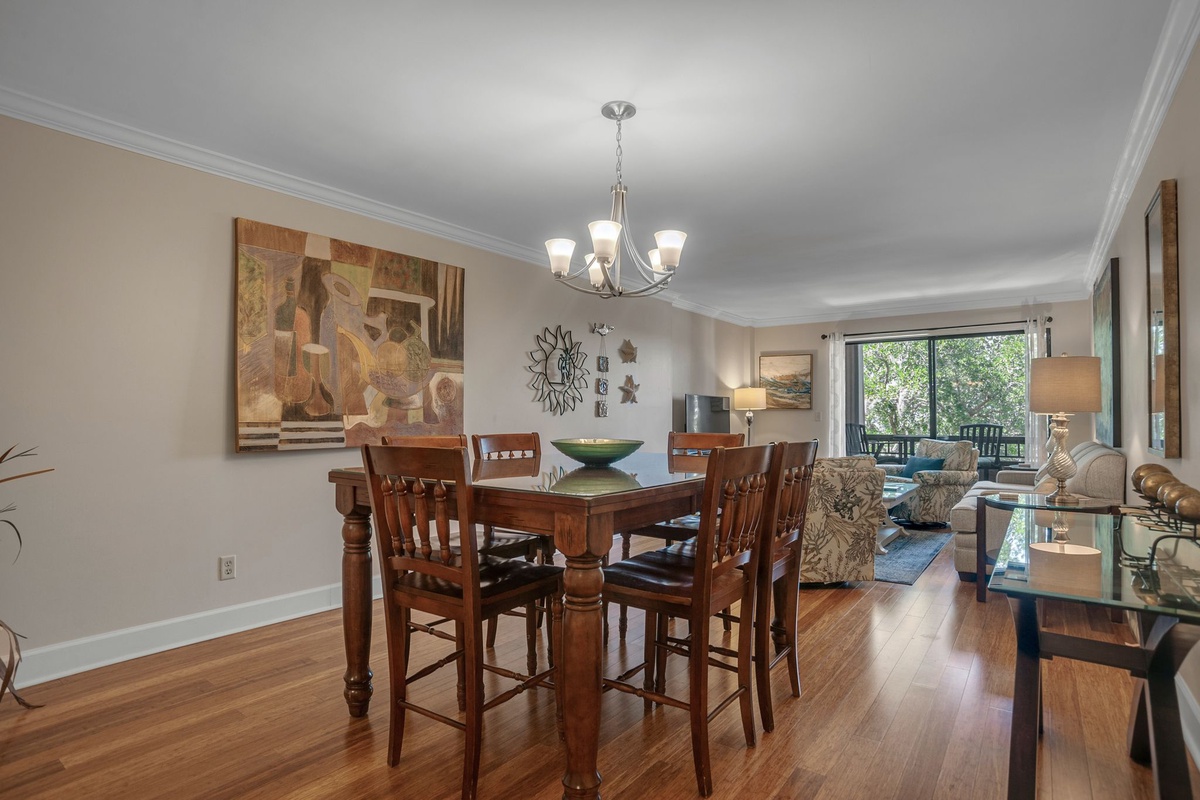 The saturnia foyer transitions into a combined living room and dining room with hardwood floors, which are both beautifully designed and infinitely pleasing. Clean lines define the relaxing, neutrally-toned space with comfortable seating including a plush, taupe sofa. Also in the living room is a 46’ wall-mounted flat panel TV. A sliding glass door opens to a private covered balcony with bistro seating for two, which basks in the waterfront beauty of Harbour Town Yacht Basin and the gentle breezes off of Calibogue Sound.