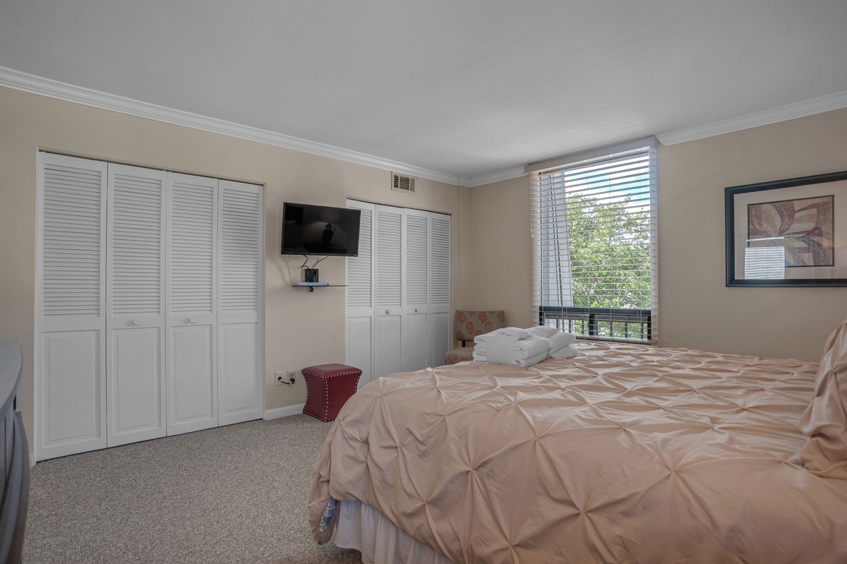 Viewing the Harbour Town Yacht Basin from a different angle, the charming second bedroom holds twin beds outfitted in pale coral and tan covers. The room is equally fresh and sleek with black geometric headboards, and it also offers a generously-sized walk-in closet. Its lovely private bath features a tan granite vanity, tile flooring and a glass door shower with an iridescent gold glass accent inlaid in the stone.