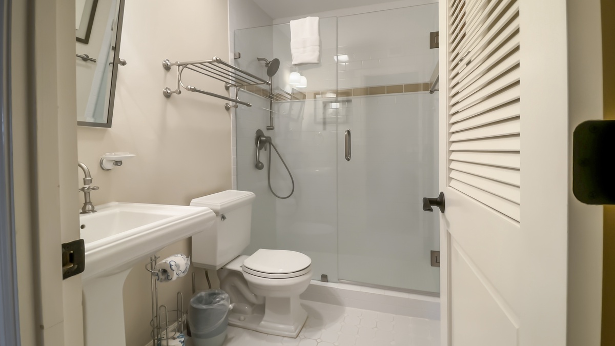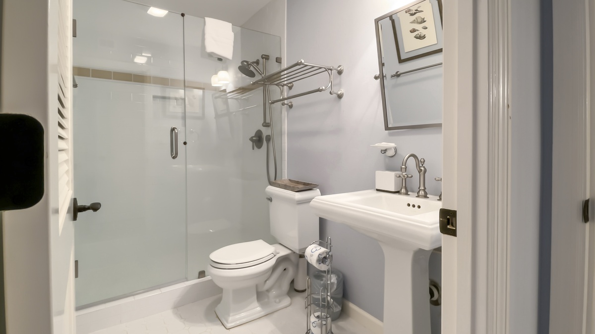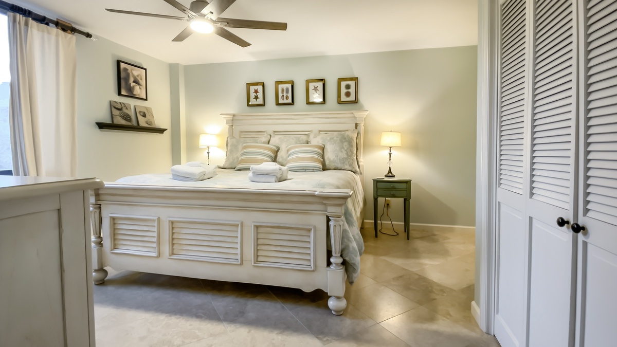 Lush comfort informed by coastal style can be found in each of the three guest rooms, located just past a narrow corridor with dry bar perfect for entertaining. The first we encounter sees a king-size bed set beneath flat-screen TV in a space with pool views, spacious closets, ceiling fan and en suite bath with walk-in shower. Next we come to a spacious nautical-themed room boasting dual twin beds, ceiling fan, flat-screen TV and access to a full bath with walk-in shower.