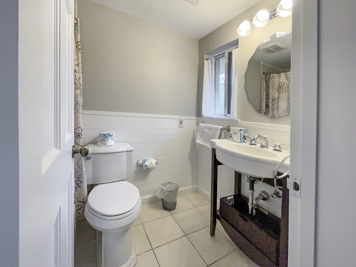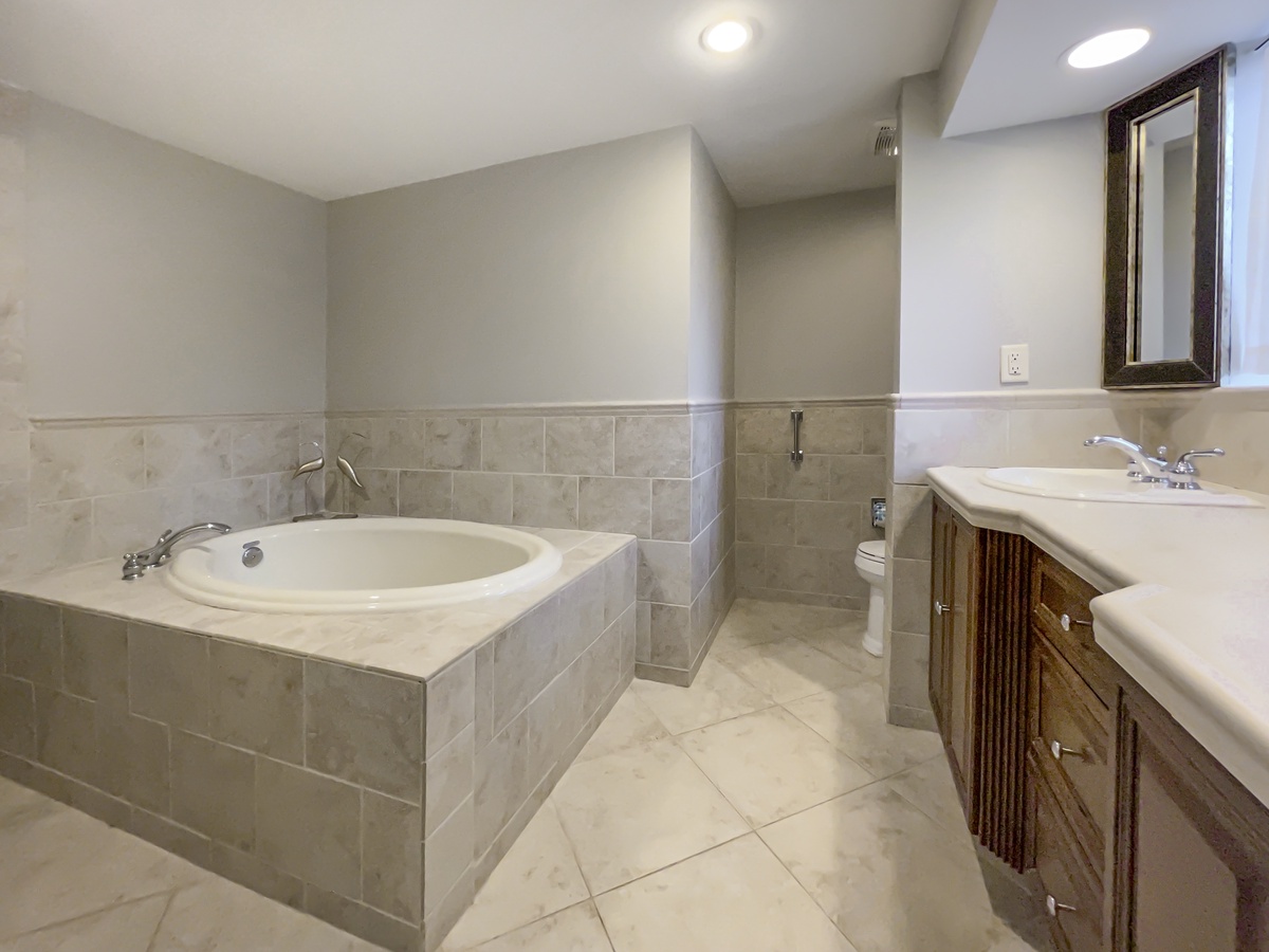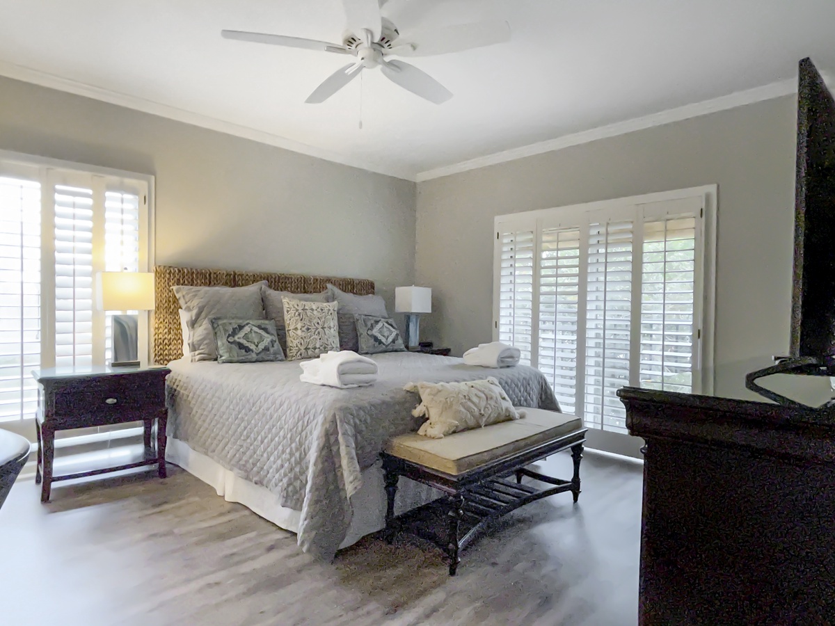 Spacious and beautifully furnished, the master bedroom holds a king-sized bed with a dark wood headboard, flat panel TV, white ceiling fan and plantation shutters. A generously sized desk and comfortable chair is located here so you can work or relax. Its private bath features a tile surrounded stretch-and-soak tub and two stone topped vanities, as well as a glass door tile-surround shower with rainfall head.