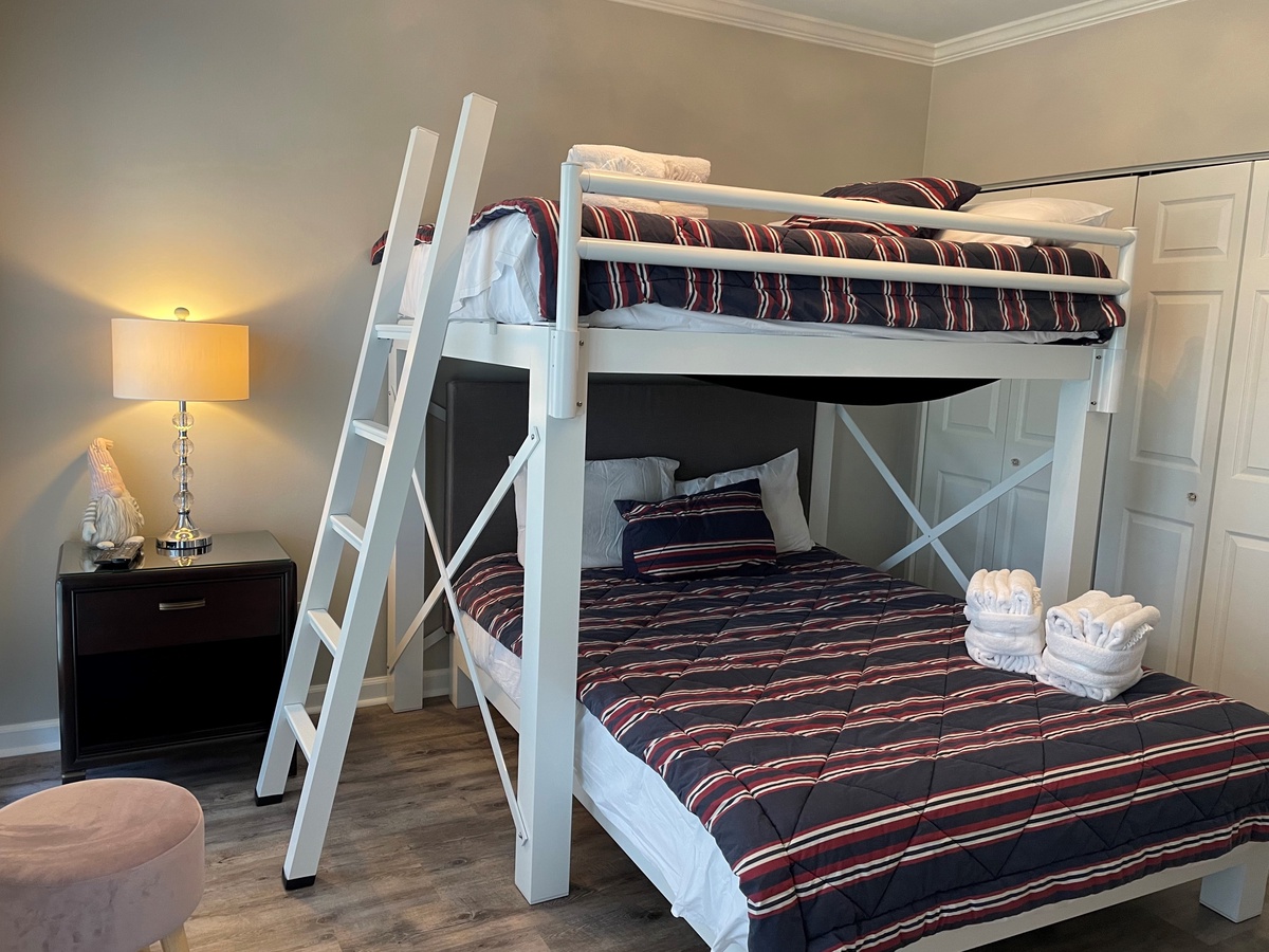 With elegant, dark wood furnishings, The second bedroom features a double over queen bunk bed, a flat screen TV and plantation shutters. Its private bath holds a pedestal sink and glass door tub/shower combination.