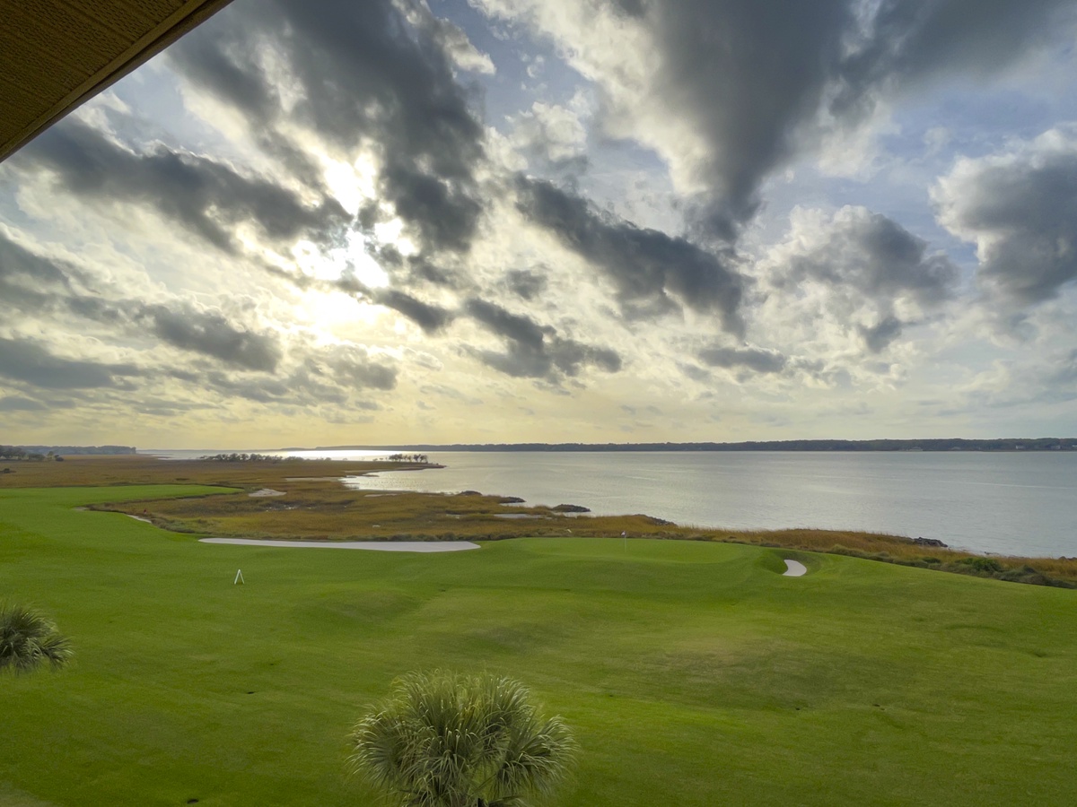 With a heart-stopping view of the sound, the living room features a beautiful sectional sofa and an extra large wall-mounted TV. Sliding glass doors open to reveal an expansive private balcony that views the water, the 18th green of the championship Harbour Town Golf Links and the-not-too-distant shores of Daufuskie Island. On the balcony there is plenty of seating to relax and enjoy the views.