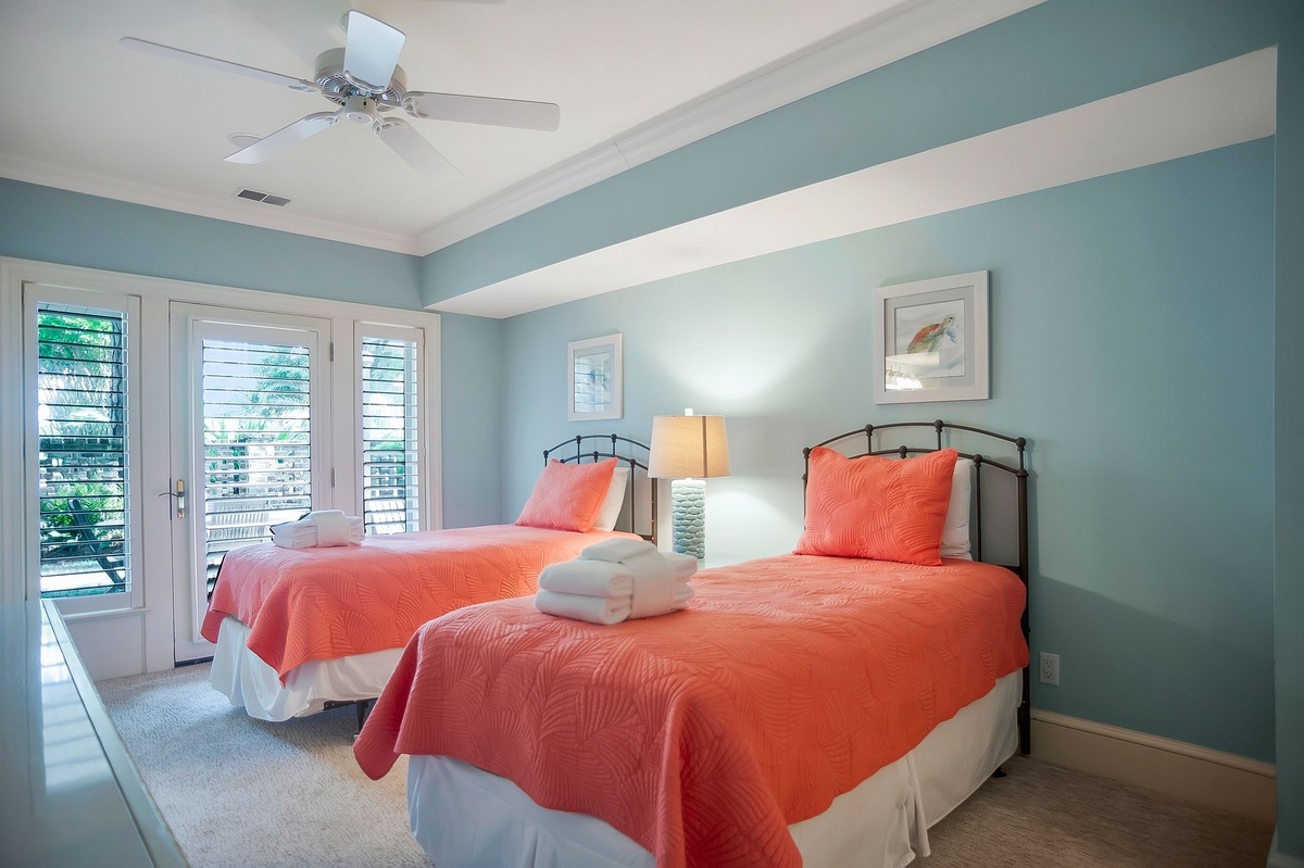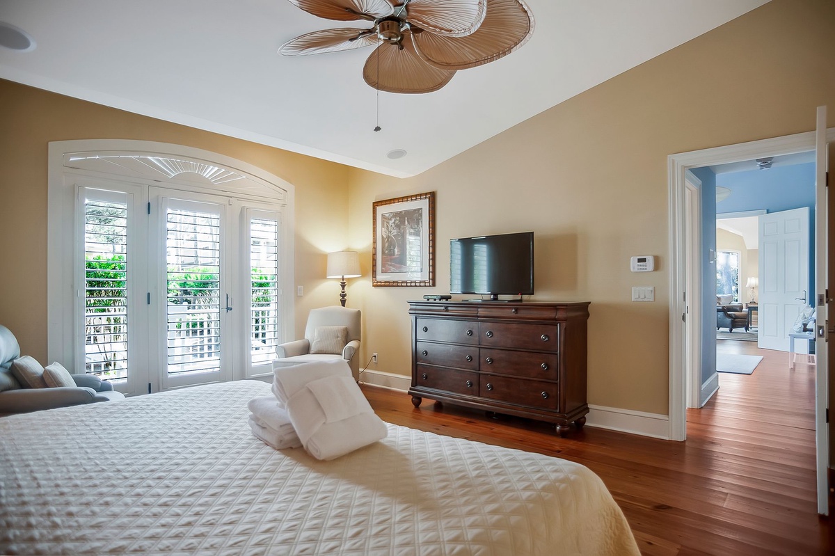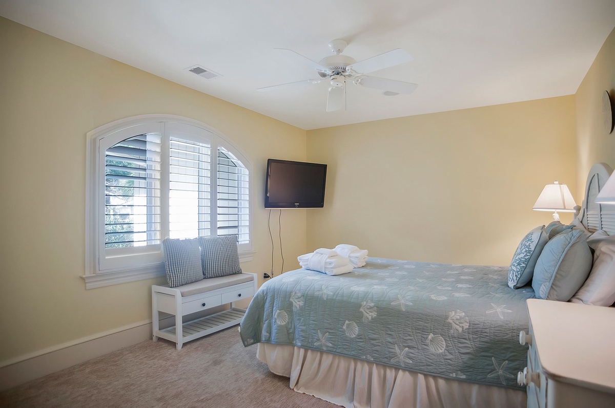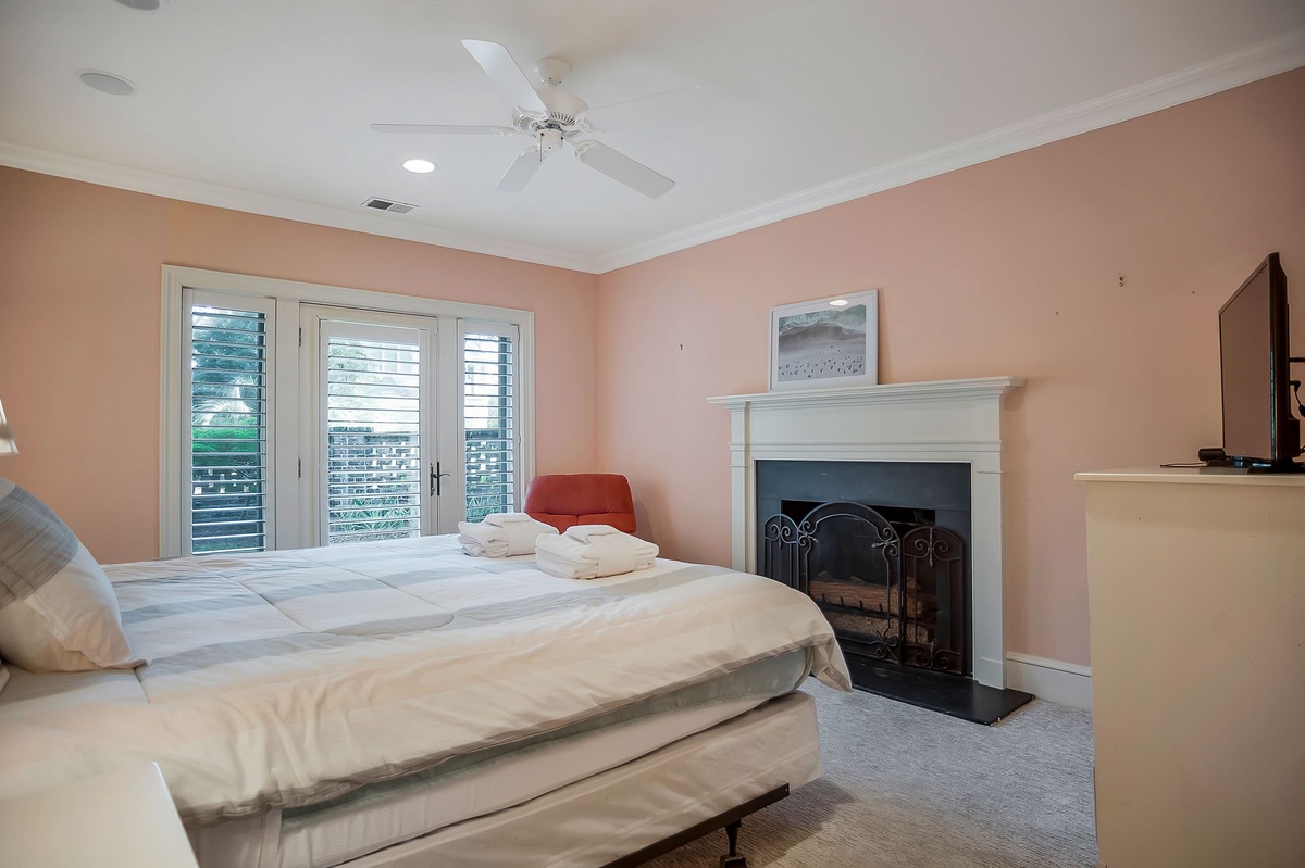 And each of these patio-side suites is a serene oasis unto itself. In one, two twin beds enjoy a space with spacious en suite bath, flat-screen TV and ceiling fan. In the other, a king bed fronts a decorative fireplace and offers its own private bath. The third of these downstairs guest rooms enjoys views out to the pool deck from a plush queen-size bed in a space with its own en suite bath, flat-screen TV and ceiling fan.