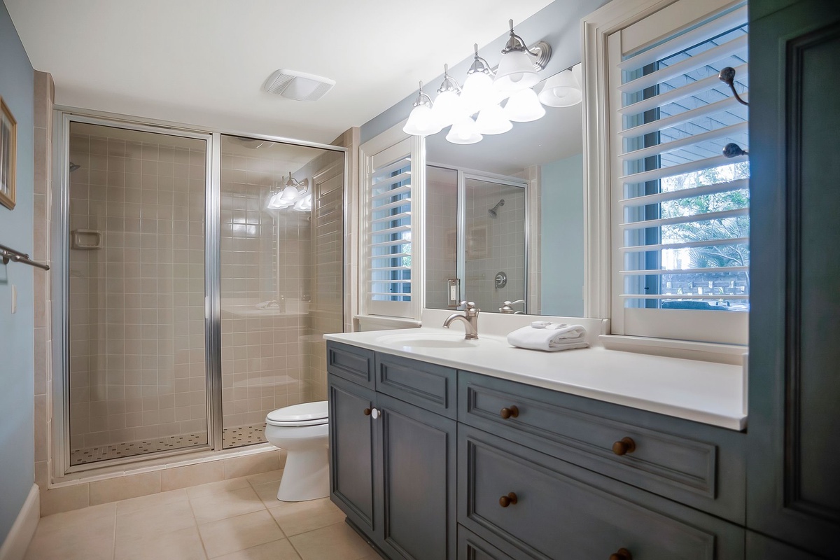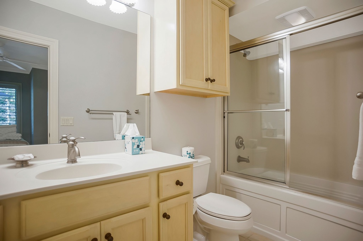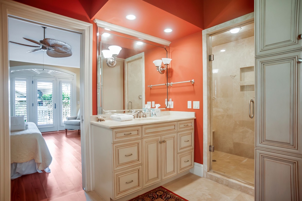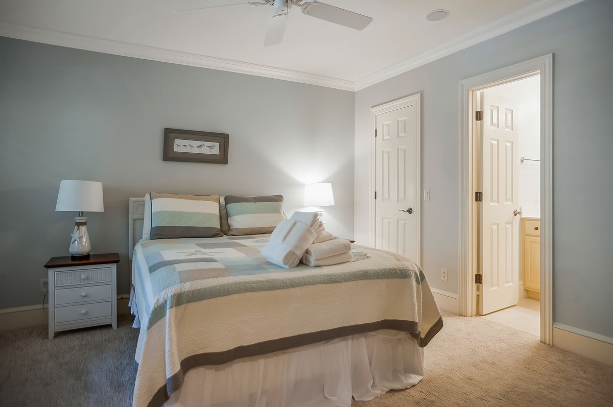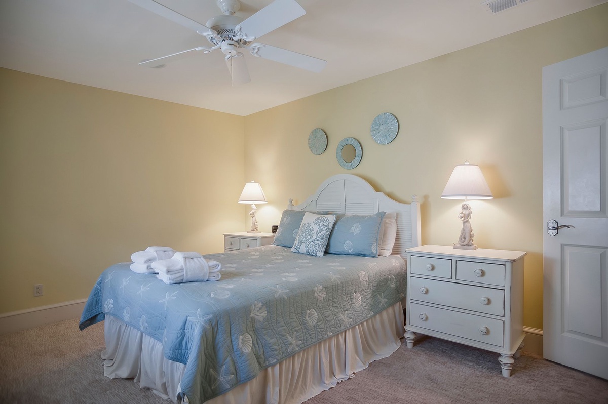 And each of these patio-side suites is a serene oasis unto itself. In one, two twin beds enjoy a space with spacious en suite bath, flat-screen TV and ceiling fan. In the other, a king bed fronts a decorative fireplace and offers its own private bath. The third of these downstairs guest rooms enjoys views out to the pool deck from a plush queen-size bed in a space with its own en suite bath, flat-screen TV and ceiling fan.