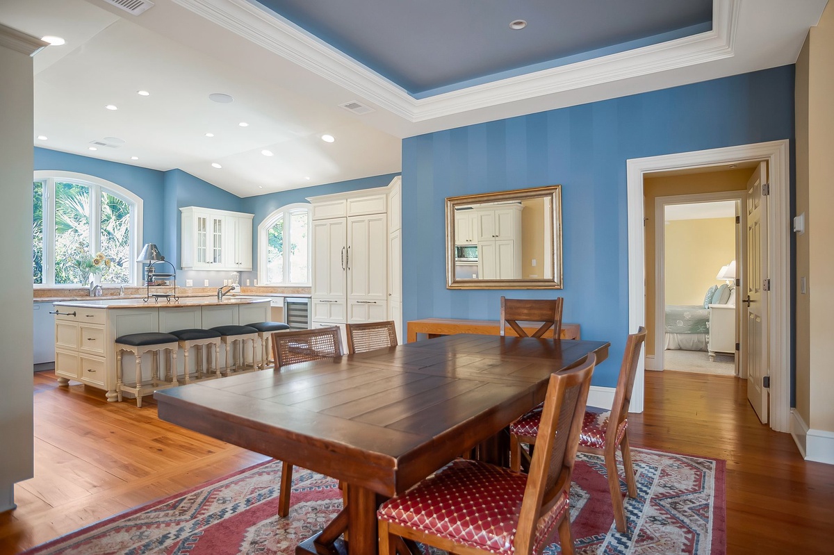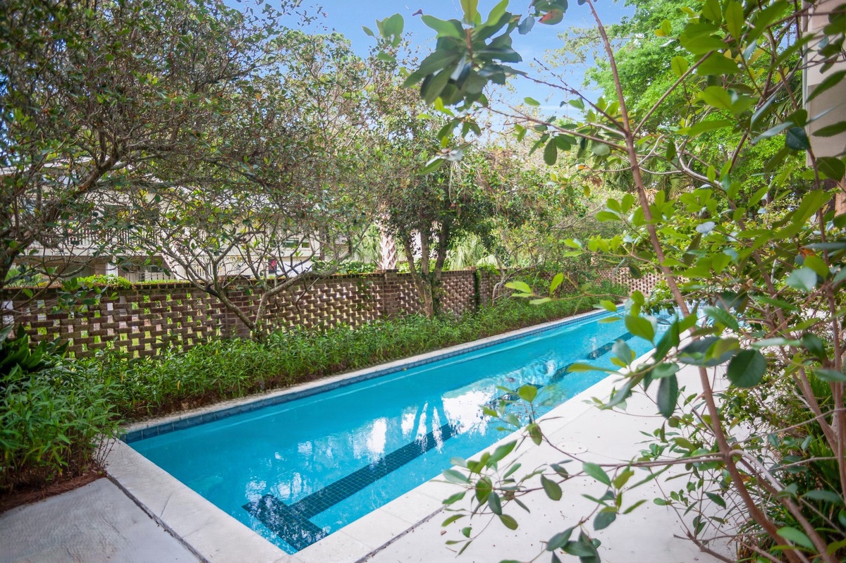 Step through these French doors and you’re enjoying enclosed outdoor enjoyment in a grand screened-in porch. And that screened-in porch is just one of the many wonders that ring the property. It opens to a wide sun-dappled deck which commands stunning views out to the water. On the other side of the property, a blissfully private pool deck sees lavish brickwork surrounding a lap pool with splash down jacuzzi ringed by foliage and outdoor dining and relaxation. There is even a serene covered patio to one side accessible only through two of the downstairs suites.