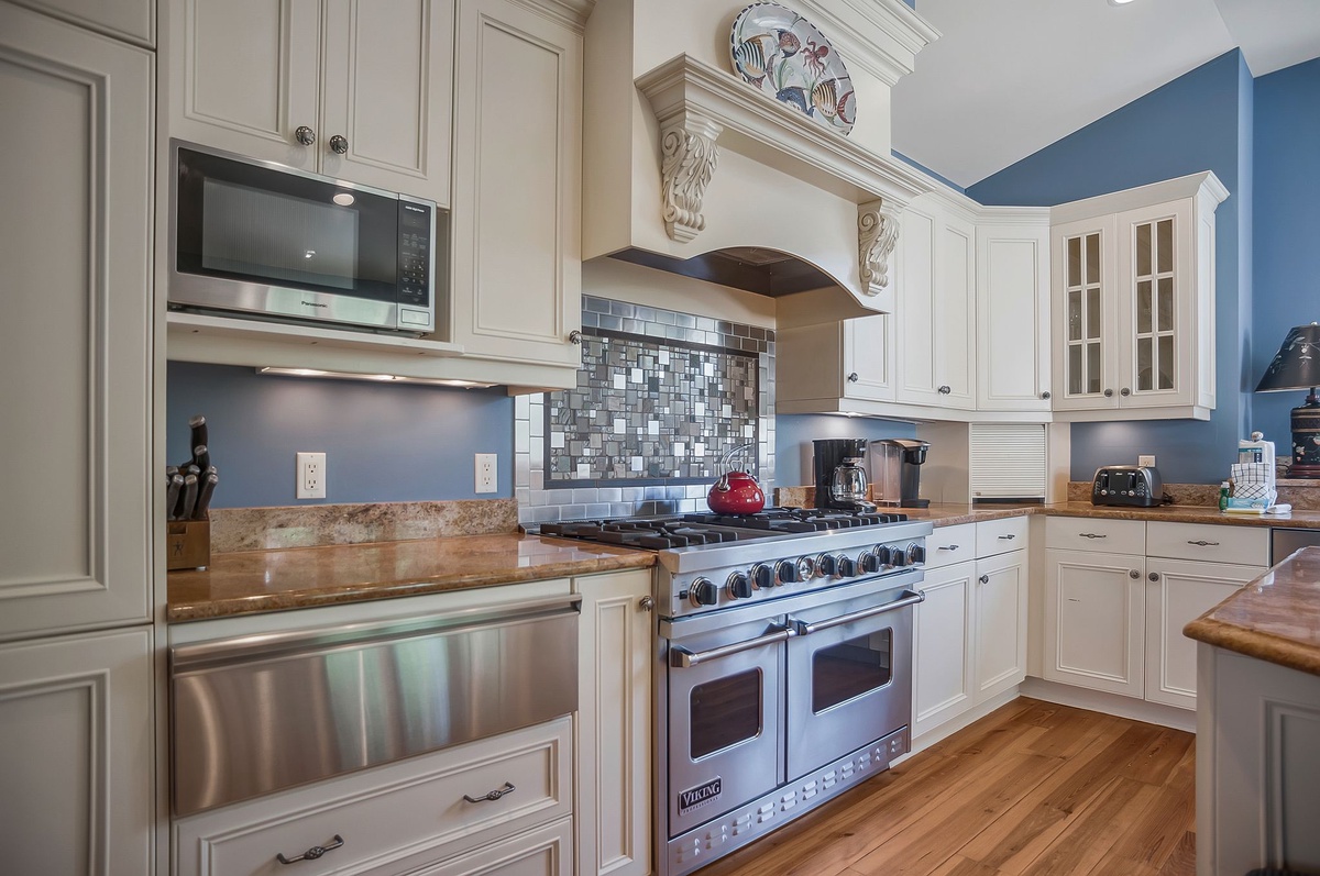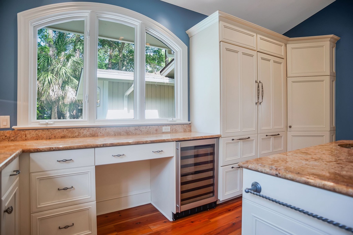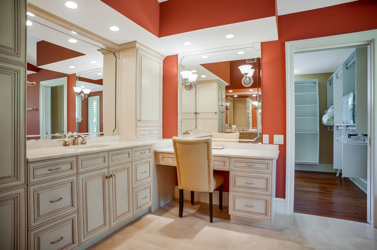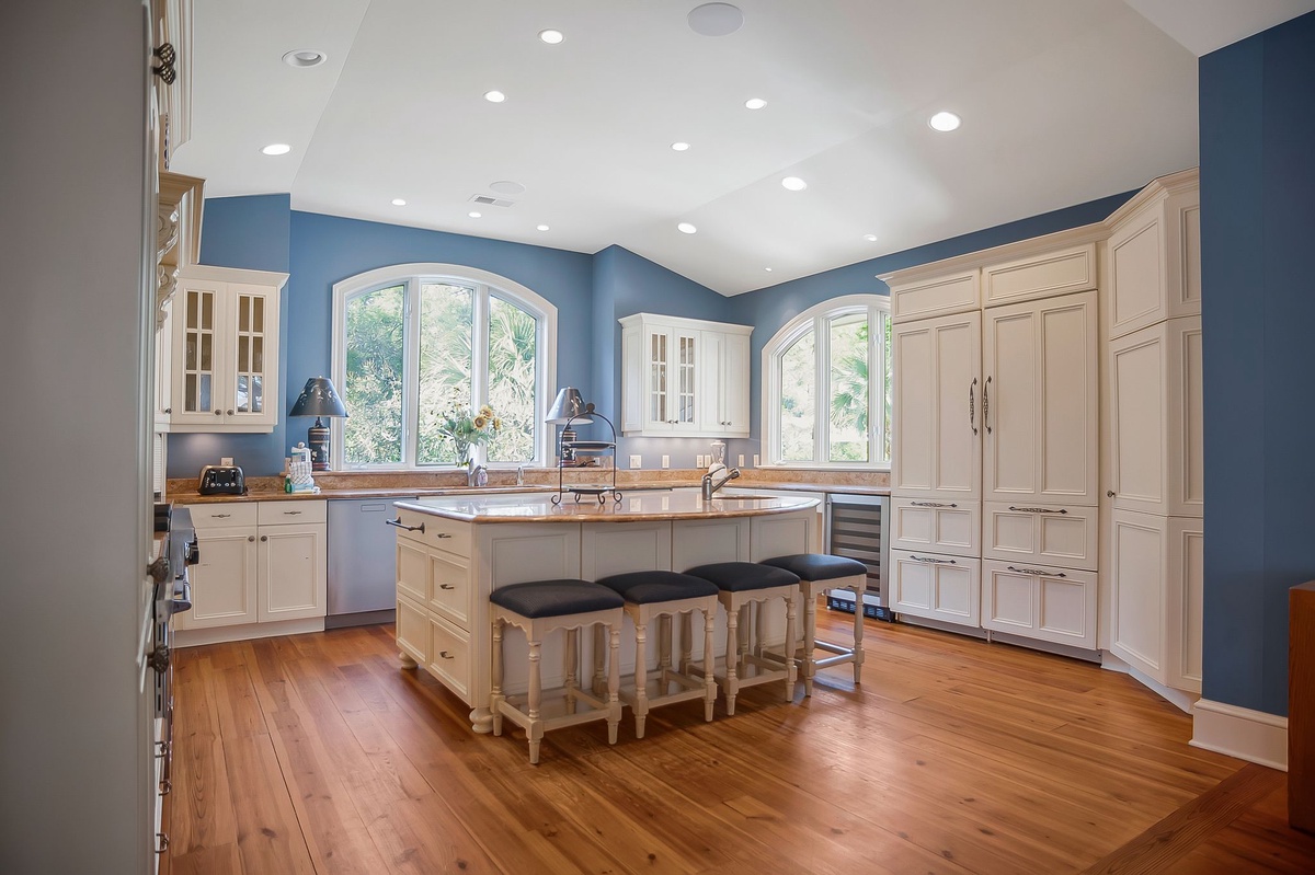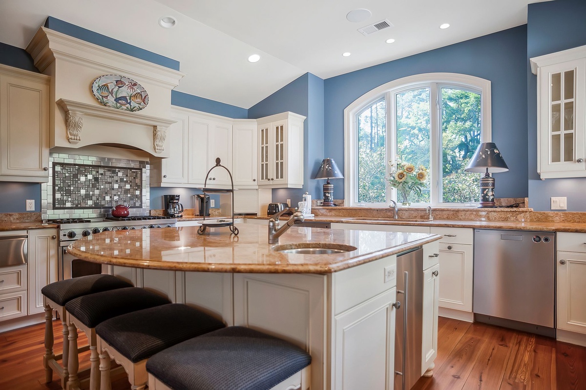 Here, ringed by windows that fill the spaces with airiness and natural light, the majestic open plan incorporates a spacious living room with a decorative brick fireplace to one end and a plush sectional sofa facing a large flat-screen TV to the other. You enter this space beside a grand formal dining room that transitions to the massive kitchen. Surrounding a wide granite island with bar seating for four you’ll find a bright and airy gourmet dream, with paneled refrigerator, six-burner chef’s range with griddle, dual ovens, warming drawer, ice cooler and wine maker making for exquisite entertainment.