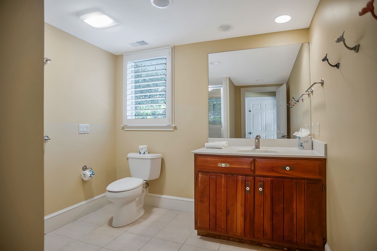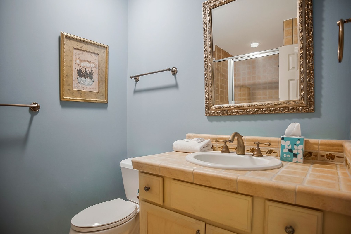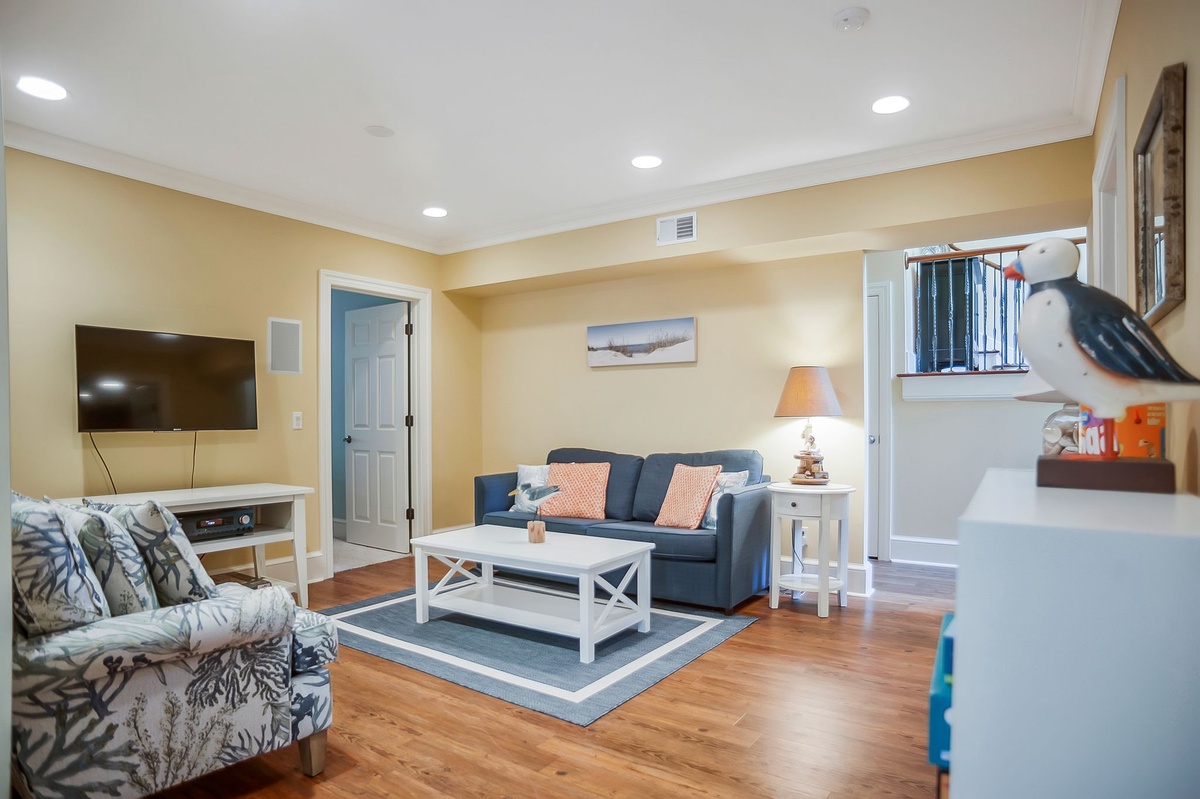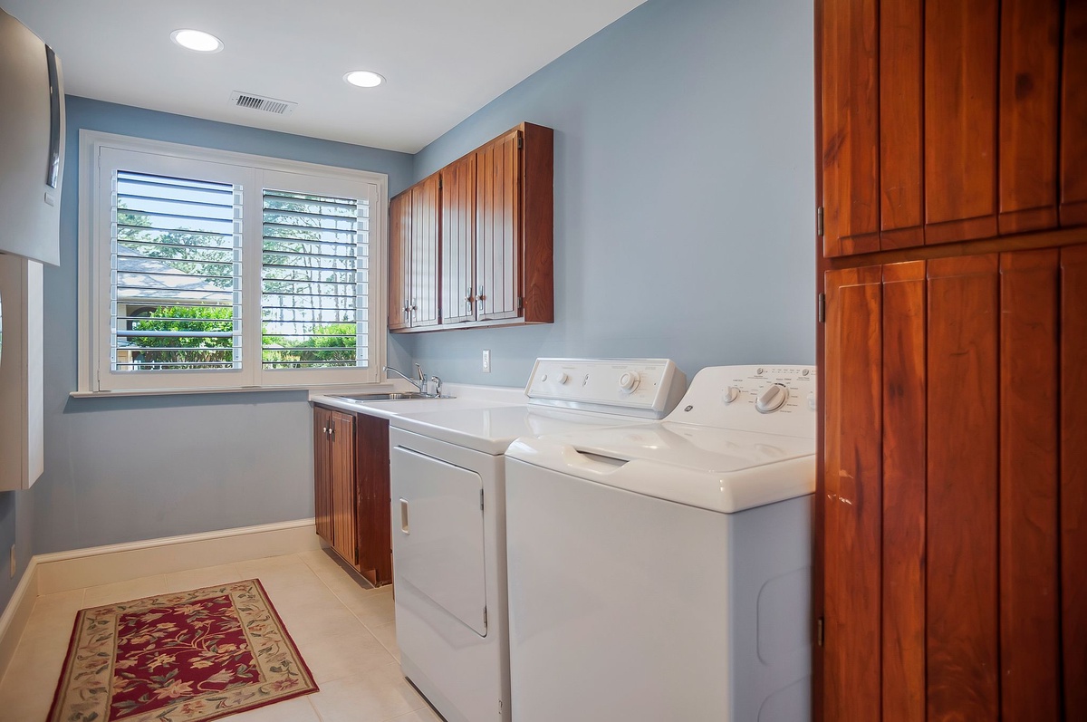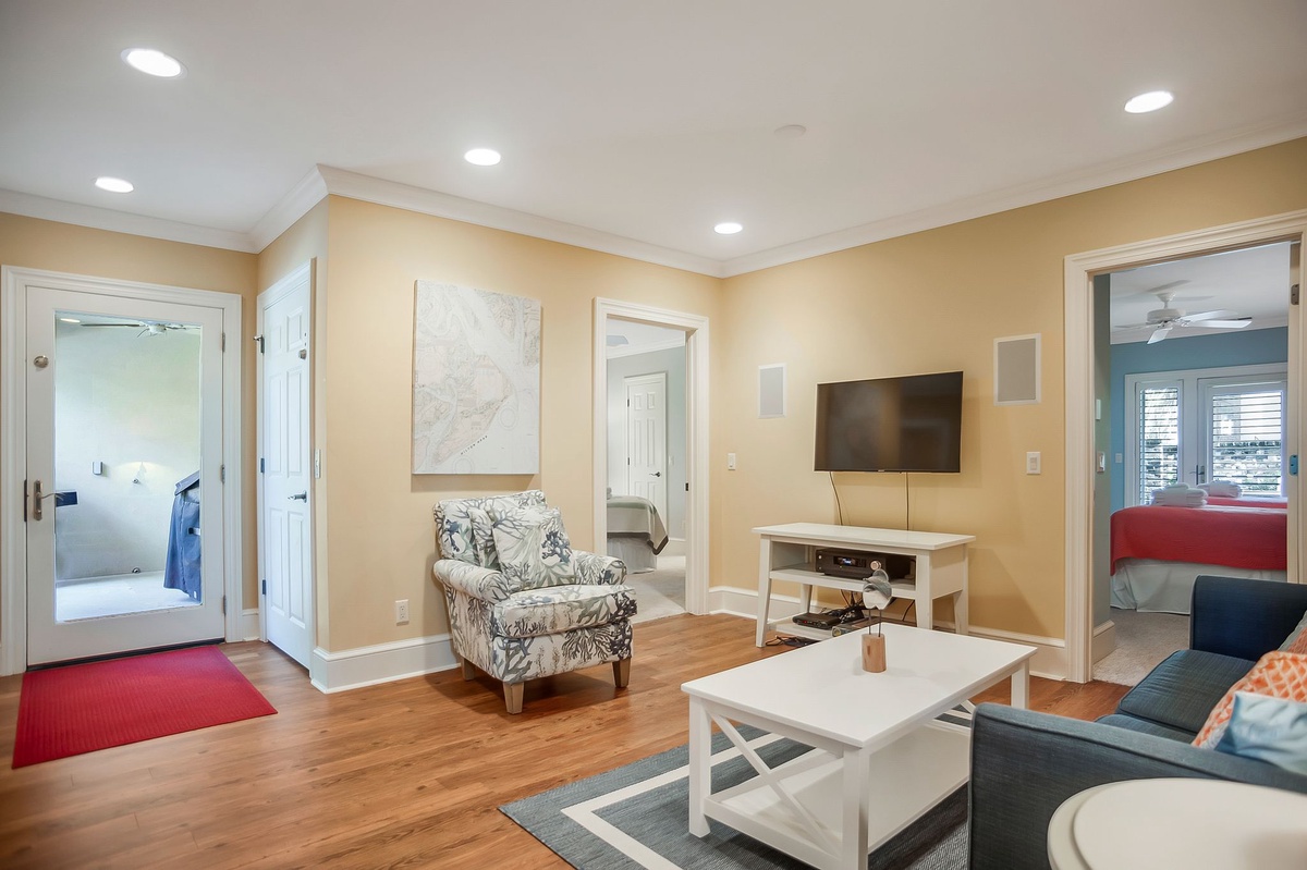 All three of these downstairs guest rooms encircle a cozy den where a sleeper sofa sits beside a large flat-screen TV placed opposite a large array of games and movies. To one side, a full laundry offers the comforts of home while the door to the pool deck lies just beyond a full bath.