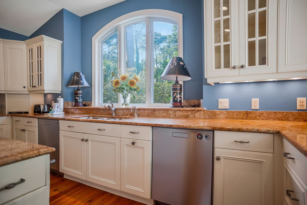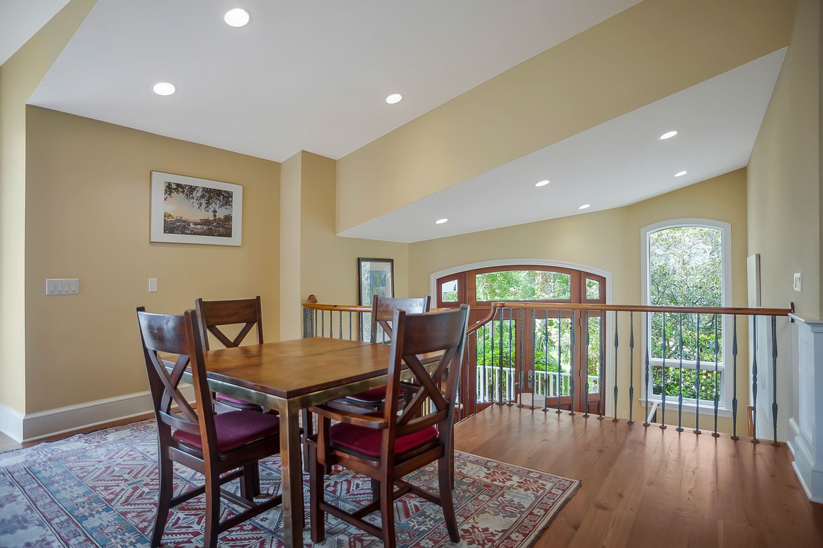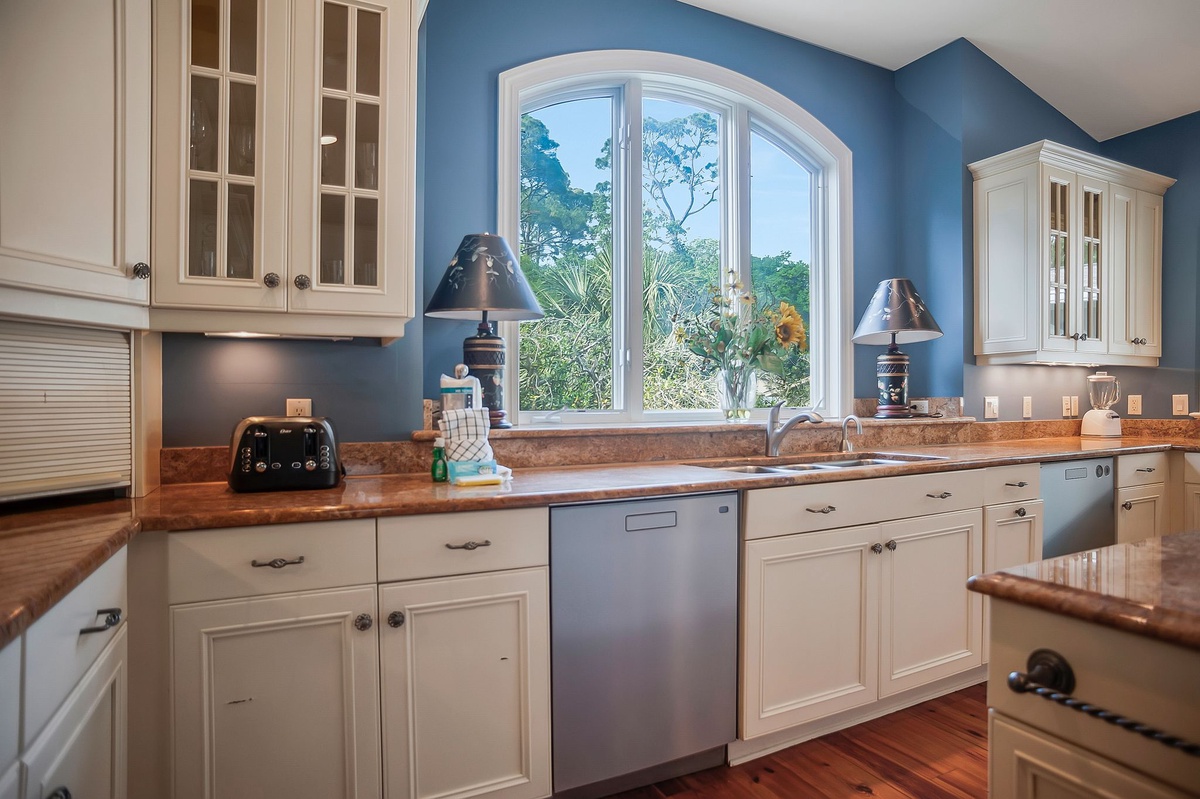 And the beauty of this entire open space is that every inch enjoys scenic views out through French doors with towering transoms framing dunes beyond.