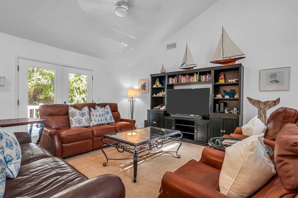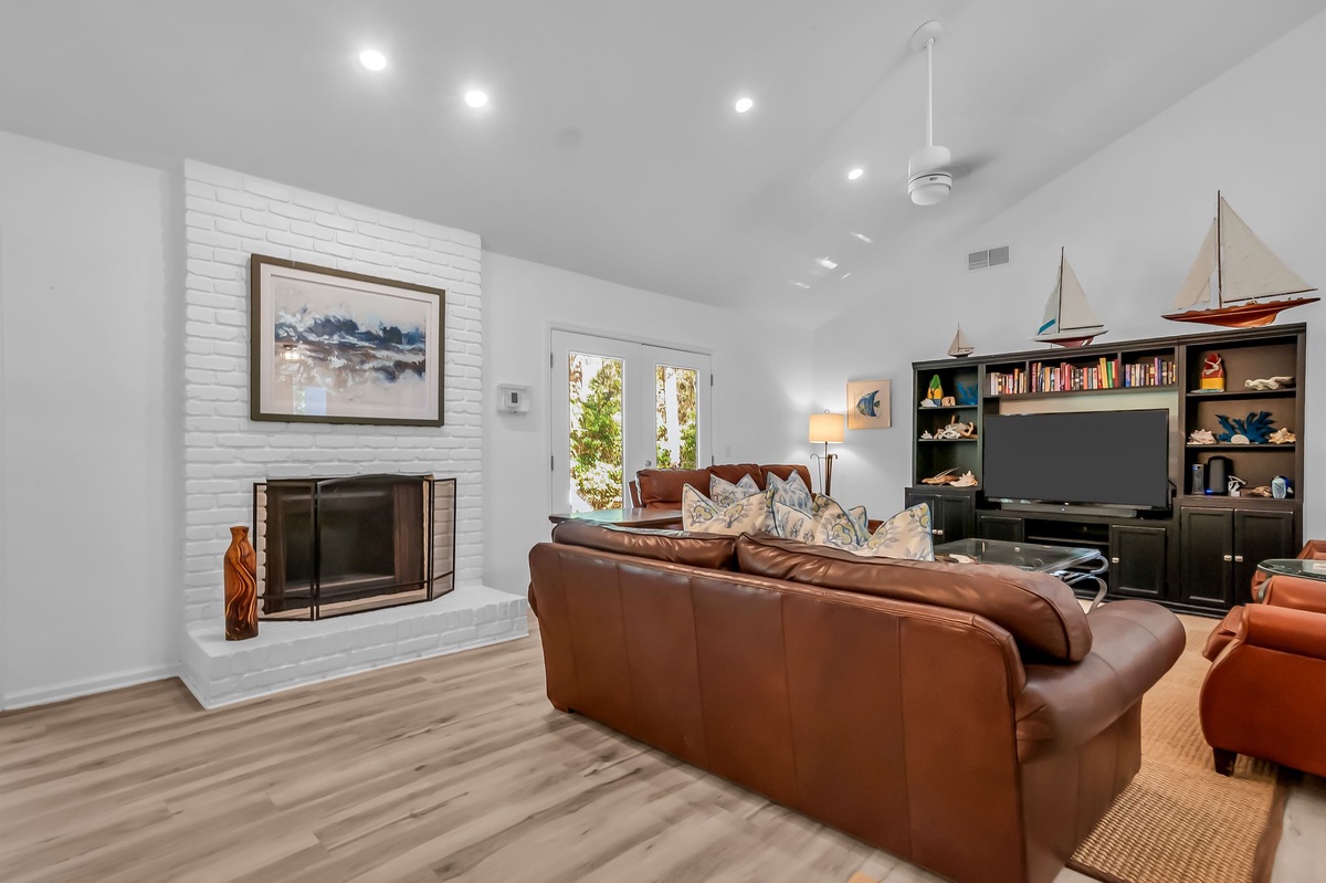 Setting the tone of spaciousness immediately upon entry, the open living and dining room stretches out before you beneath a soaring vaulted ceiling. Two rich leather sofas and matching armchairs encircle a flat-screen TV at one end, with French doors bathing the space in natural light. At the far end, a matching set of French doors illuminates formal dining for five in the round beside a decorative fireplace.