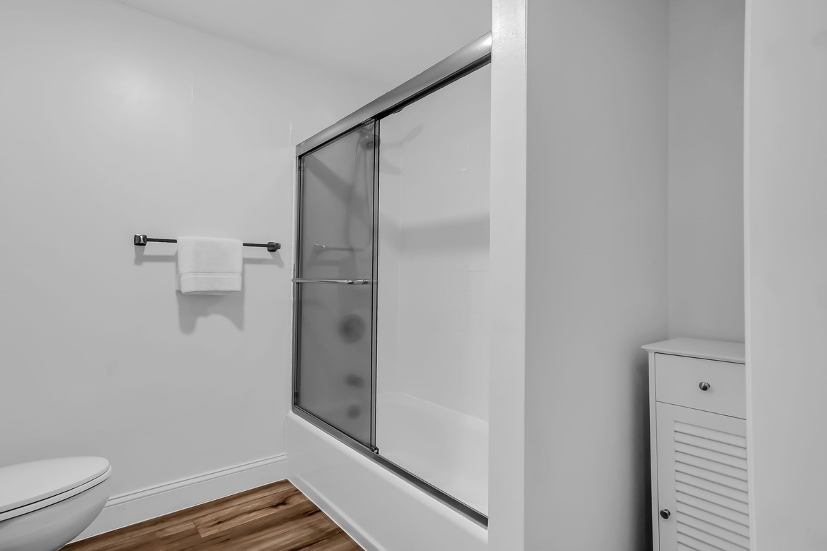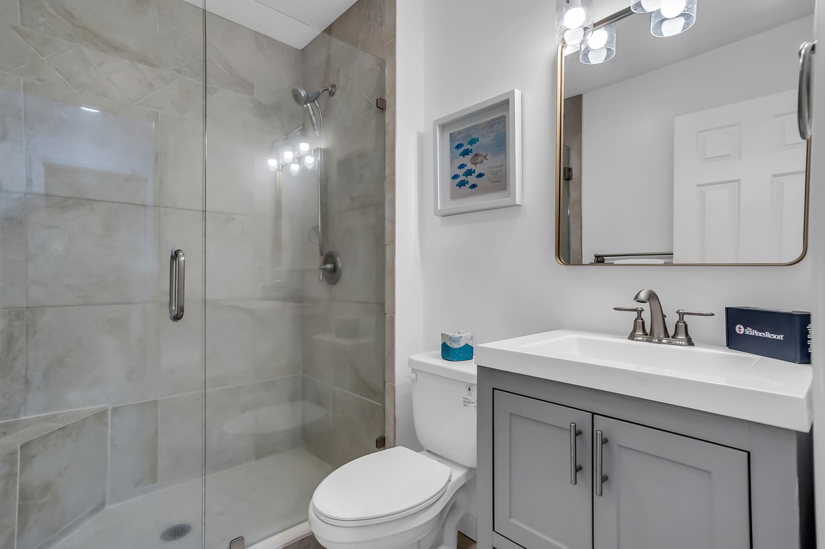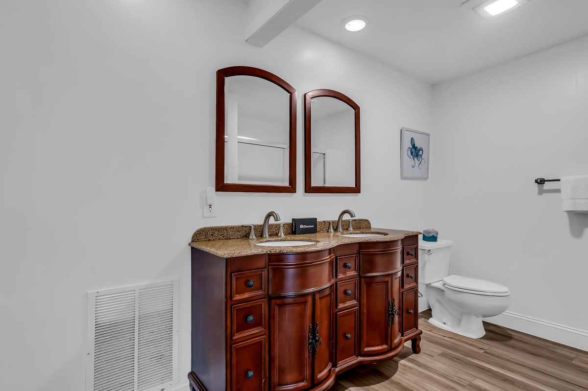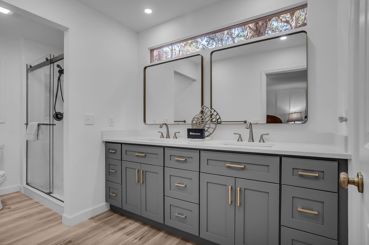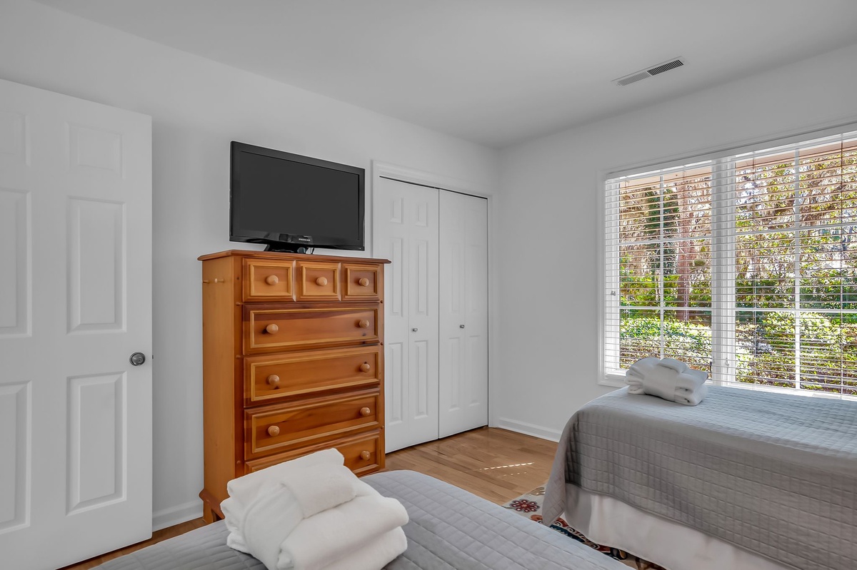 The spacious comforts extend into each of the four guest rooms. The first, boasting two twin beds, enjoys roomy closets, flat-screen TV and wide windows facing the forest. The second layers a king-size bed in dark wood elements that carry throughout. Both share access to a full bath with single-basin vanity and walk-in shower.