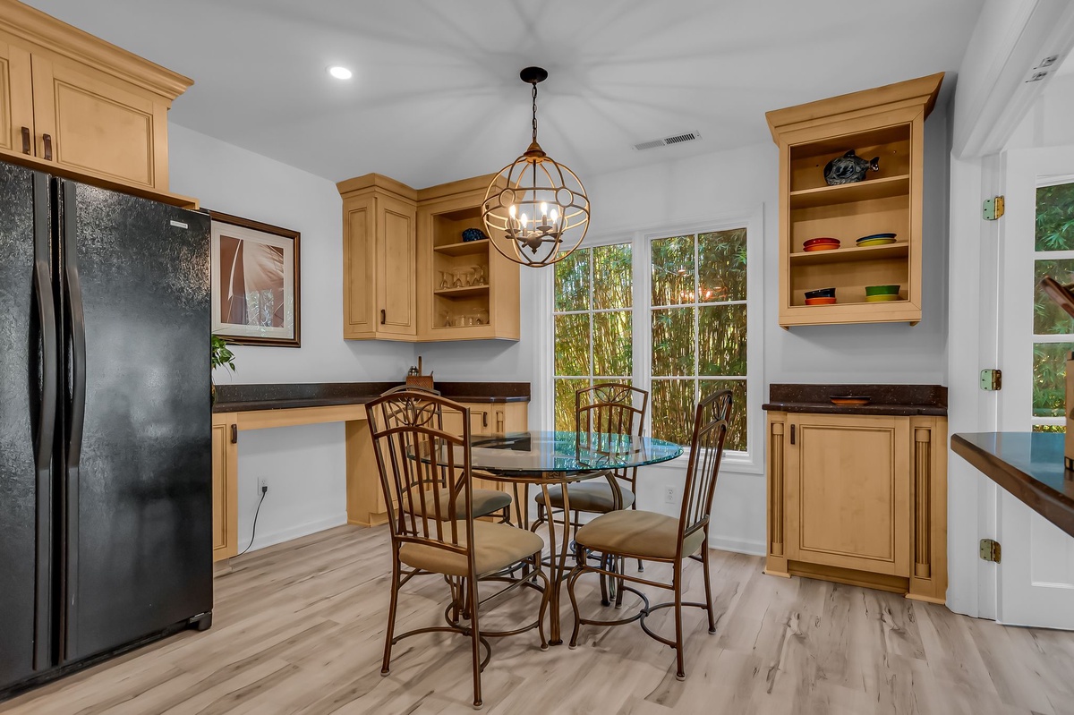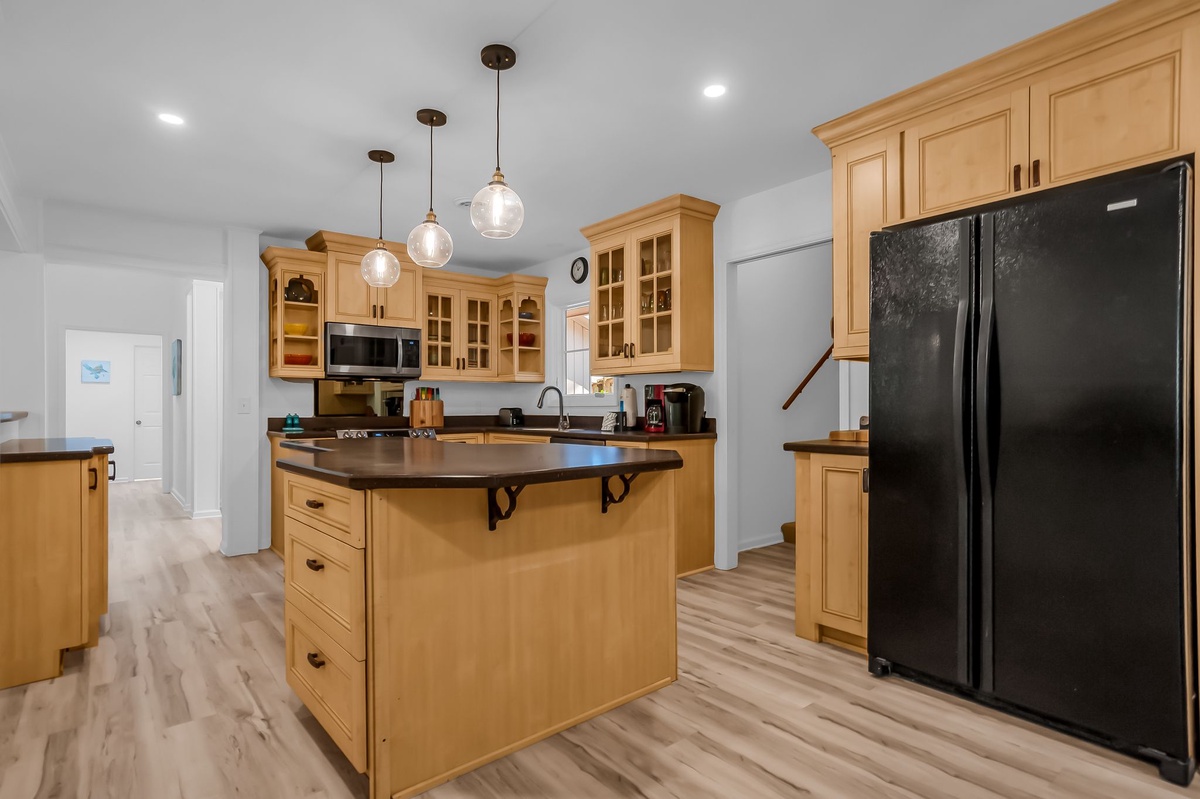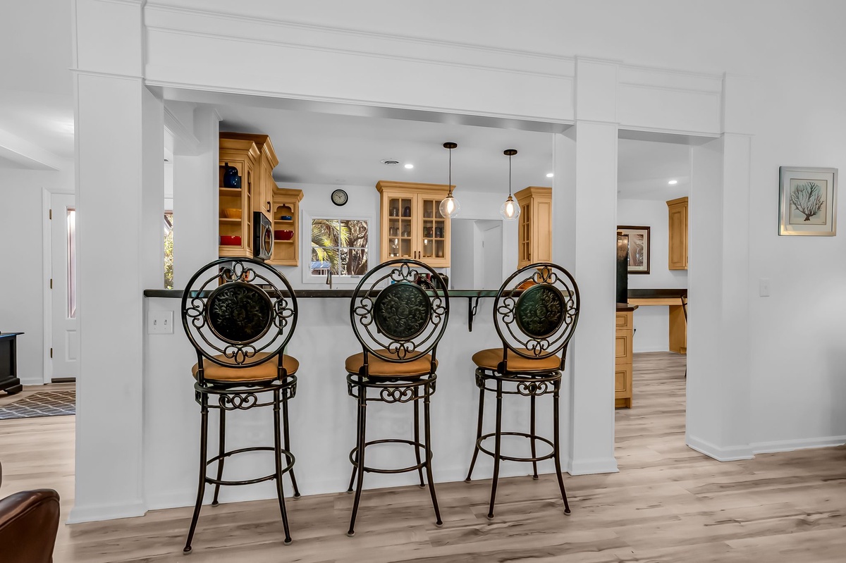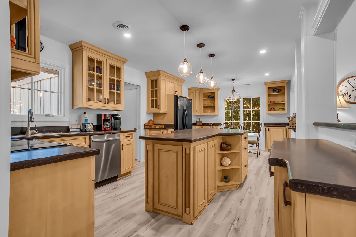 Further bar-style dining for three can be found nearby at a wide counter transitioning into the massive kitchen, built to feed the crowd in style. With rich custom cabinets, granite counters and a full suite of appliance, along with dine-in seating for four, the kitchen offers a true spot for gathering the whole group.