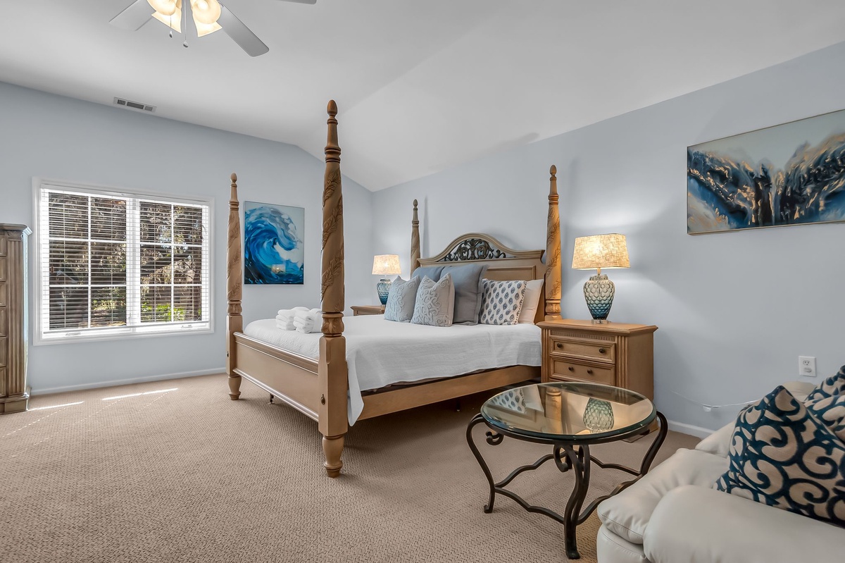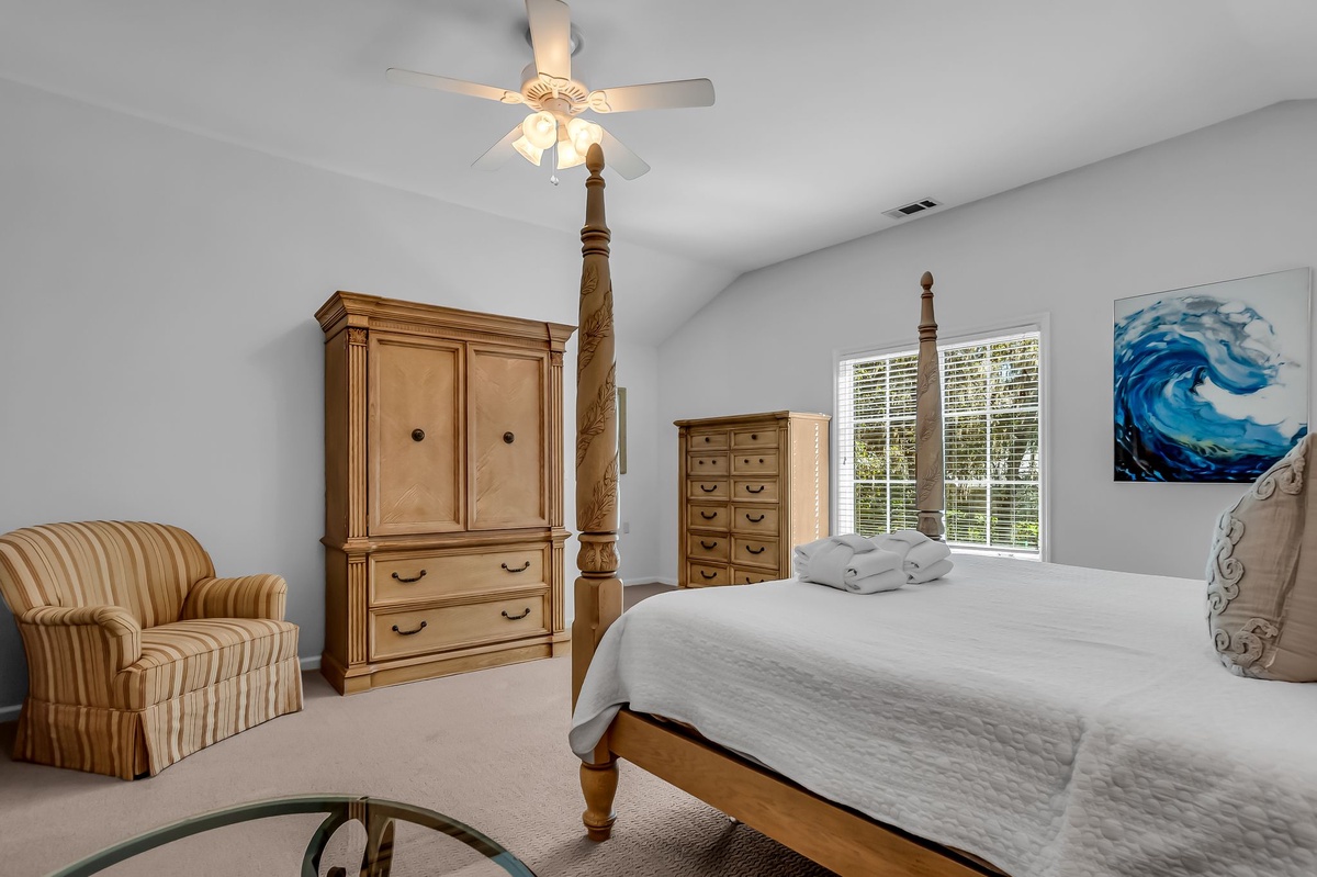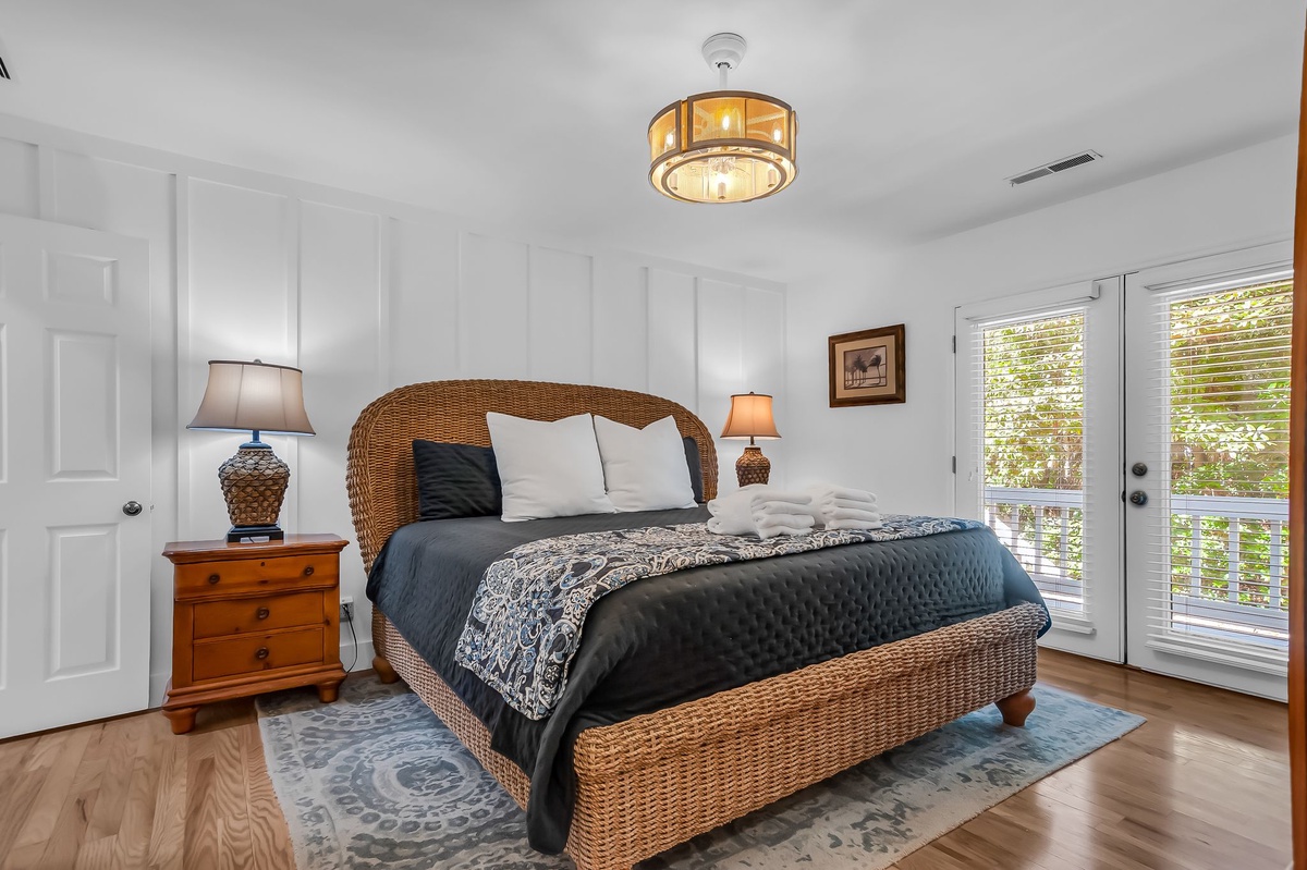 The remaining guest rooms, both suites, offer two different takes on luxurious comfort. In one, a king-size bed set in wicker framing enjoys private access to the rear porch as well as en suite bath with dual-basin vanity and walk-in shower. The final suite sees a four-post king-size bed set beneath tall ceilings with a ceiling fan overhead end ensuite bath boasting antique style dual-basin vanity and a tub/shower combo.