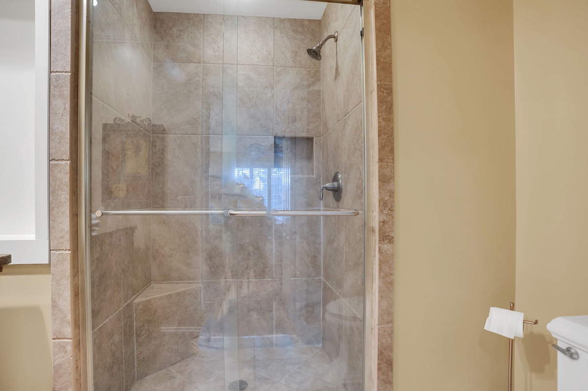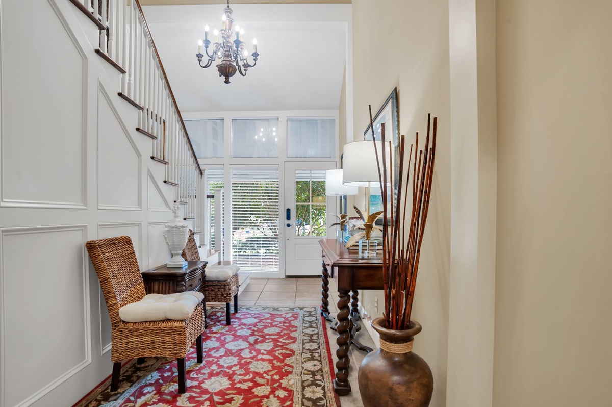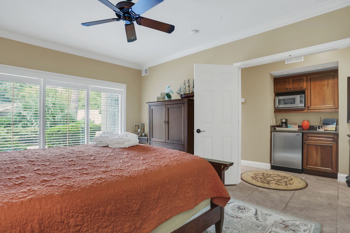 Entering through a dazzling sunlit foyer whose paneled staircase rises up to the third floor above, tile floors guide you back toward the lush ground floor suite. Enjoying its own private kitchenette with minifridge and microwave, this private getaway sees a king-size bed anchoring a full suite with private bath behind French doors on one end, and with sliders at the other leading to a private shaded patio.