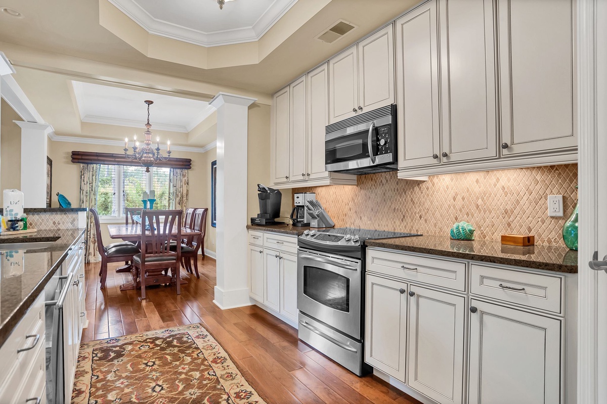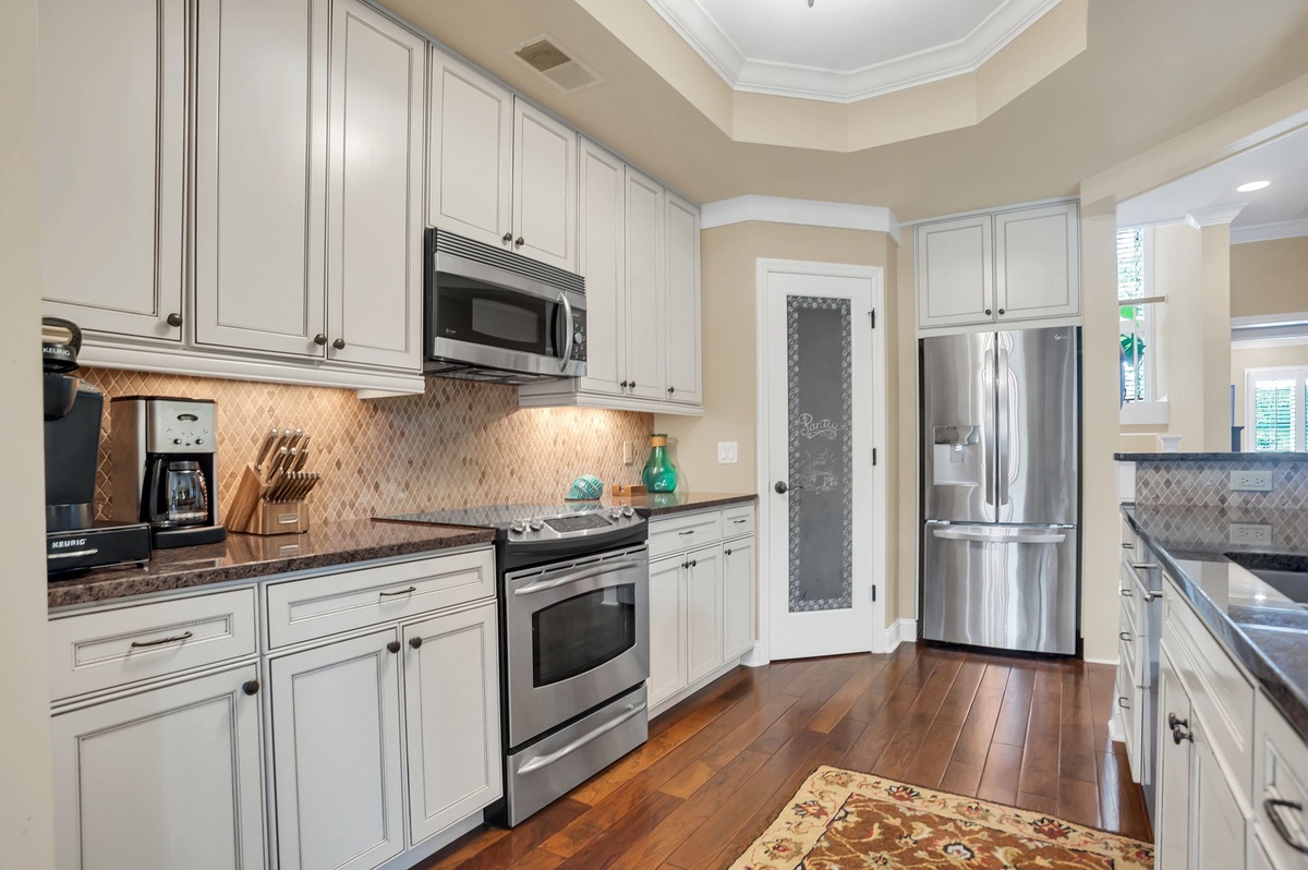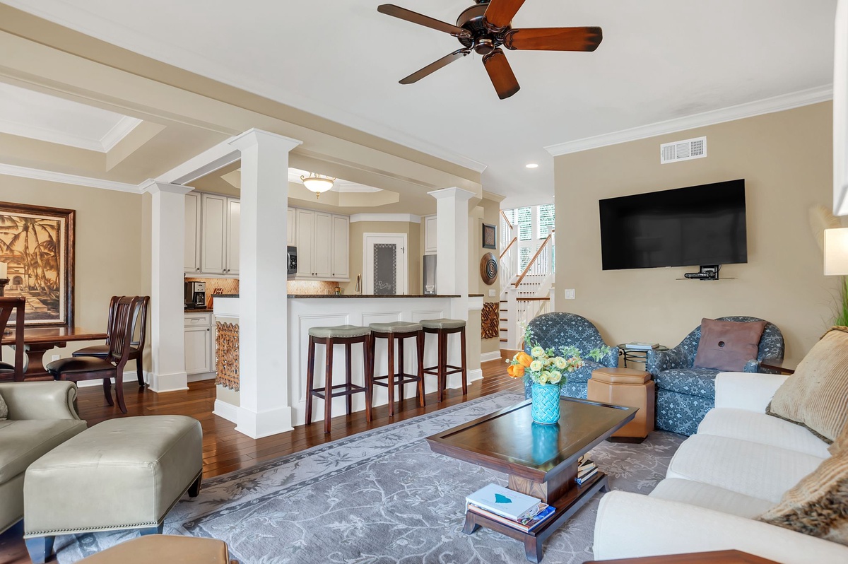 Indulge in stately Southern charm paired with an elegantly airy layout in this soaring three-story villa set in the heart of Harbour Town.