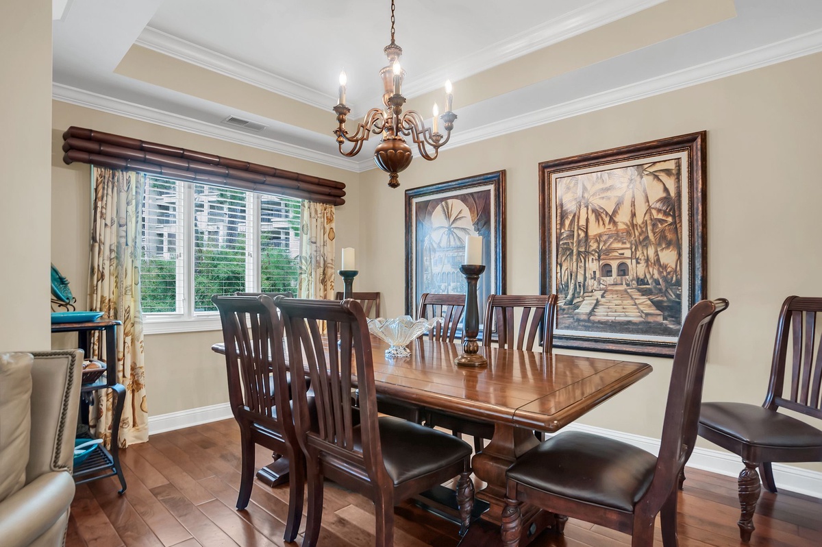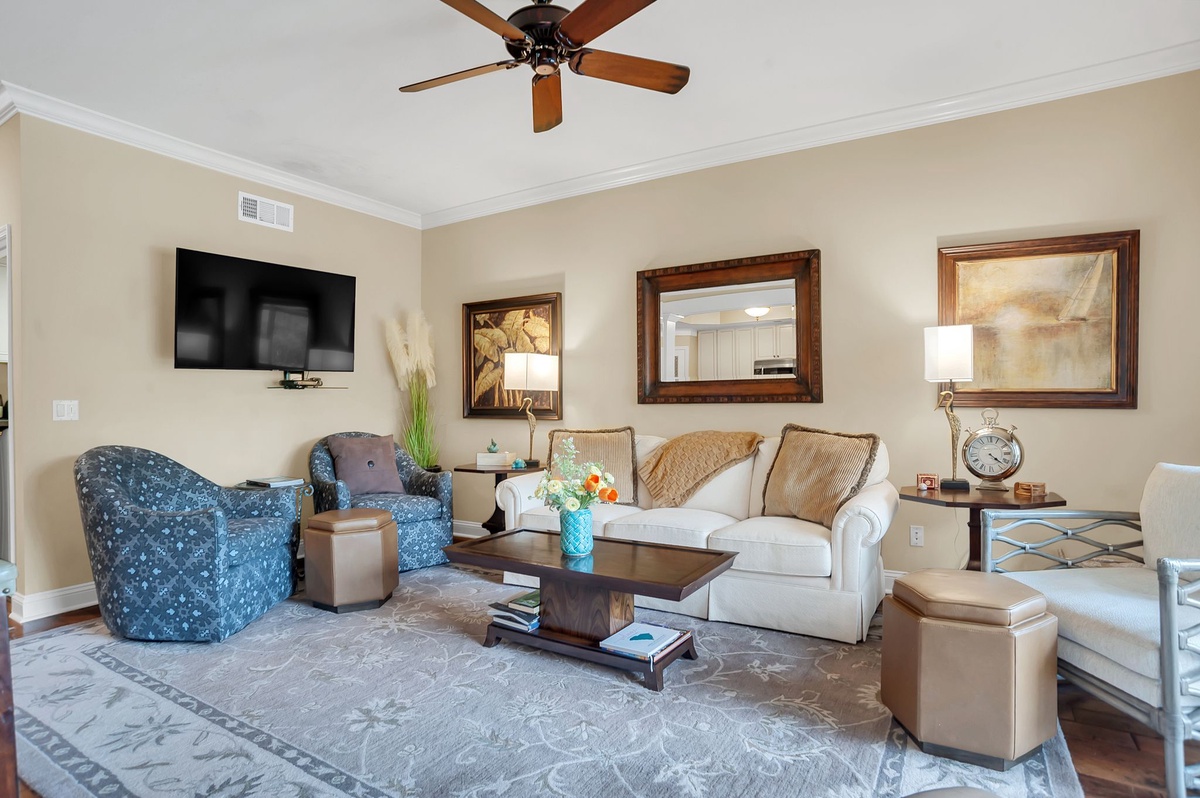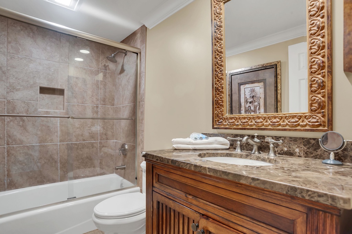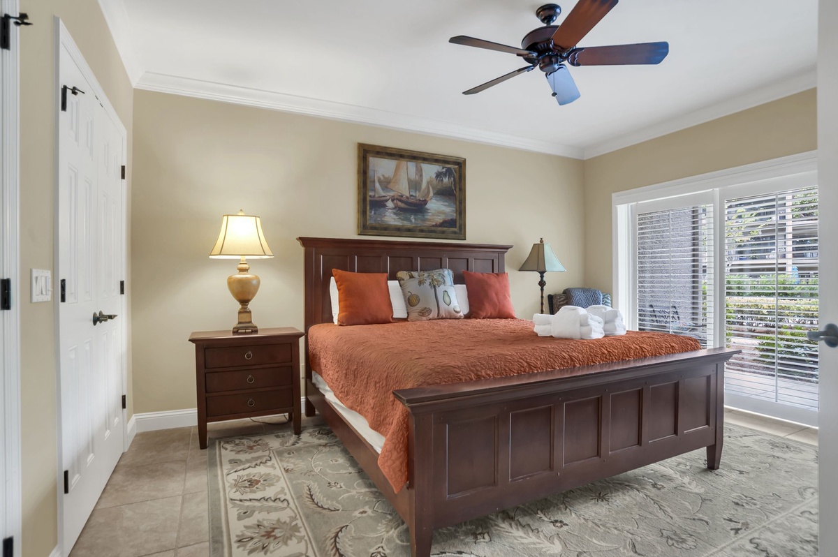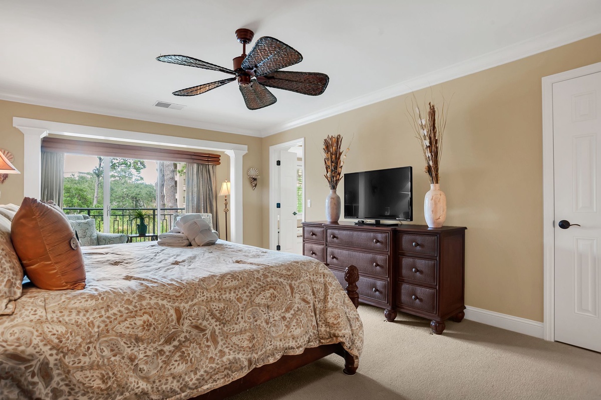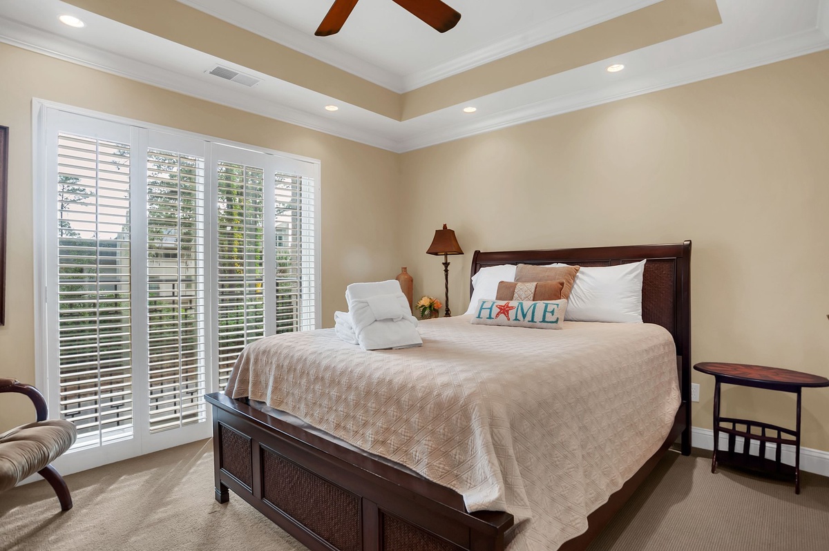Finally, the primary suite drives home the grandeur and elegance of this remarkable villa, a sprawling space whose king-size bed rests beside a private alcove set off by columns. Along with a ceiling fan and flat-screen TV, this suite enjoys an opulent private bath with jetted tub, walk-in shower and his-and-hers vanities.