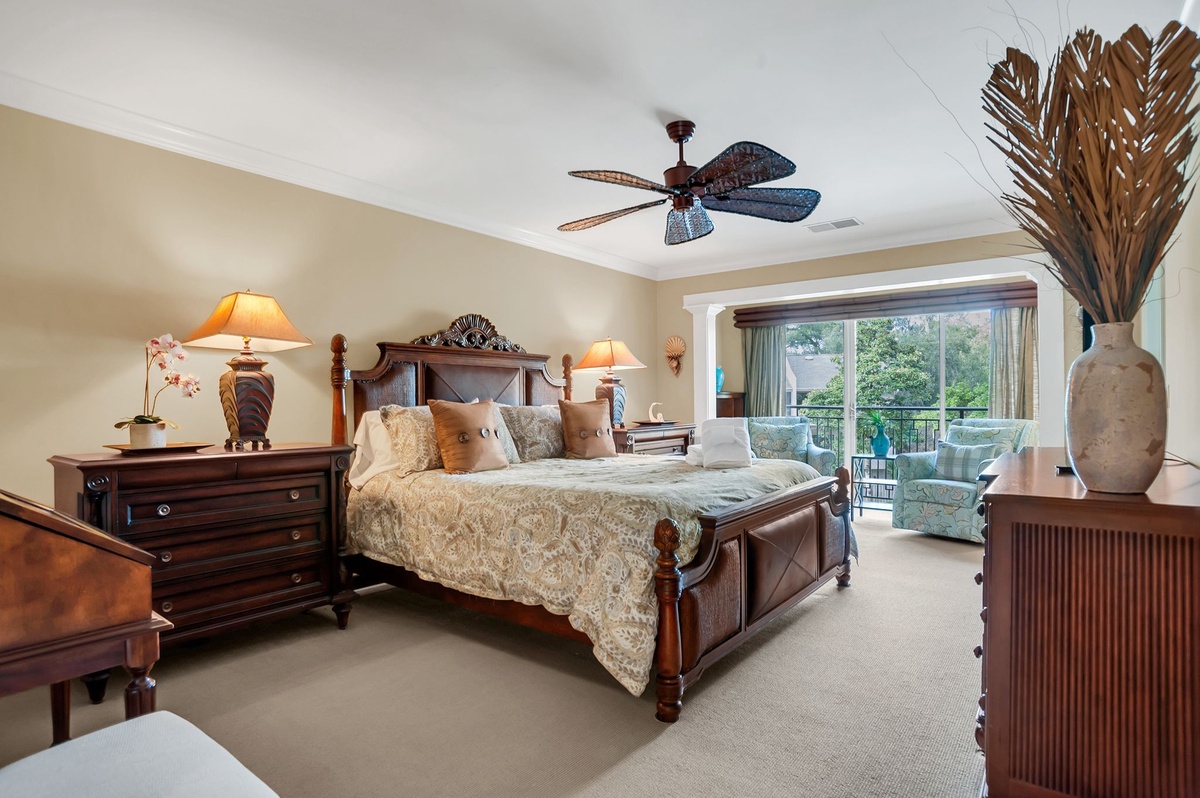 Step through those sliders and you’re on a lushly shaded balcony overlooking the Harbour South Club swimming pool. A second guest suite can be found on this floor, setting a king-size bed amid short pile carpeting in a space with ceiling fan, flat-screen TV, private Juliet balcony and en suite bath.