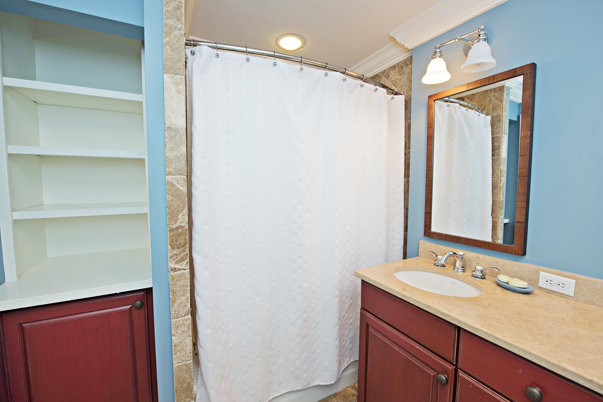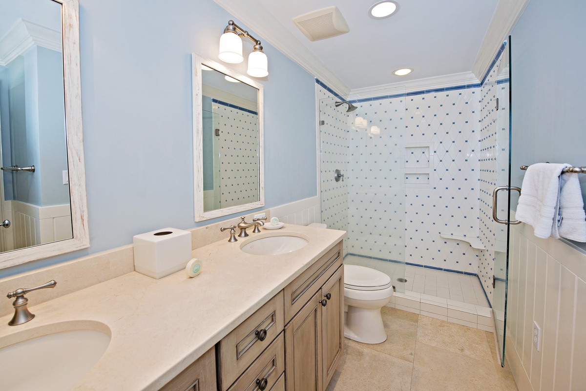 In hues of red, blue and gold, another bedroom houses twin beds plus a sleeper sofa, and features a TV and private bath with double vanity and a stone surround tub/shower combination.