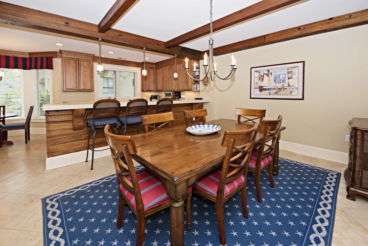 Up a few more stairs inside and you are on the level which features the gourmet-quality kitchen, with thick stone countertops, stainless steel appliances, a breakfast table for four and another view of Calibogue Sound, seen from a different angle altogether. A neighboring dining area seats six, and both rooms have a stunning view of Harbour Town.
