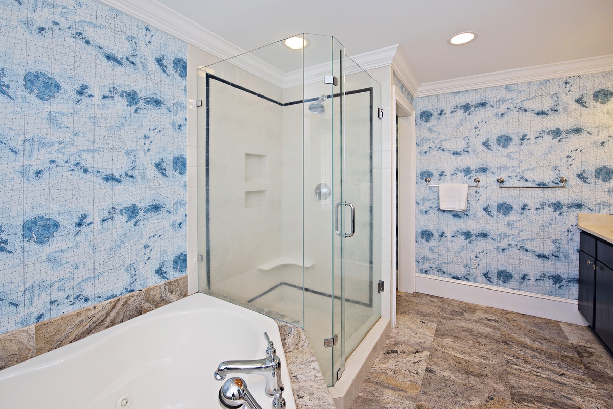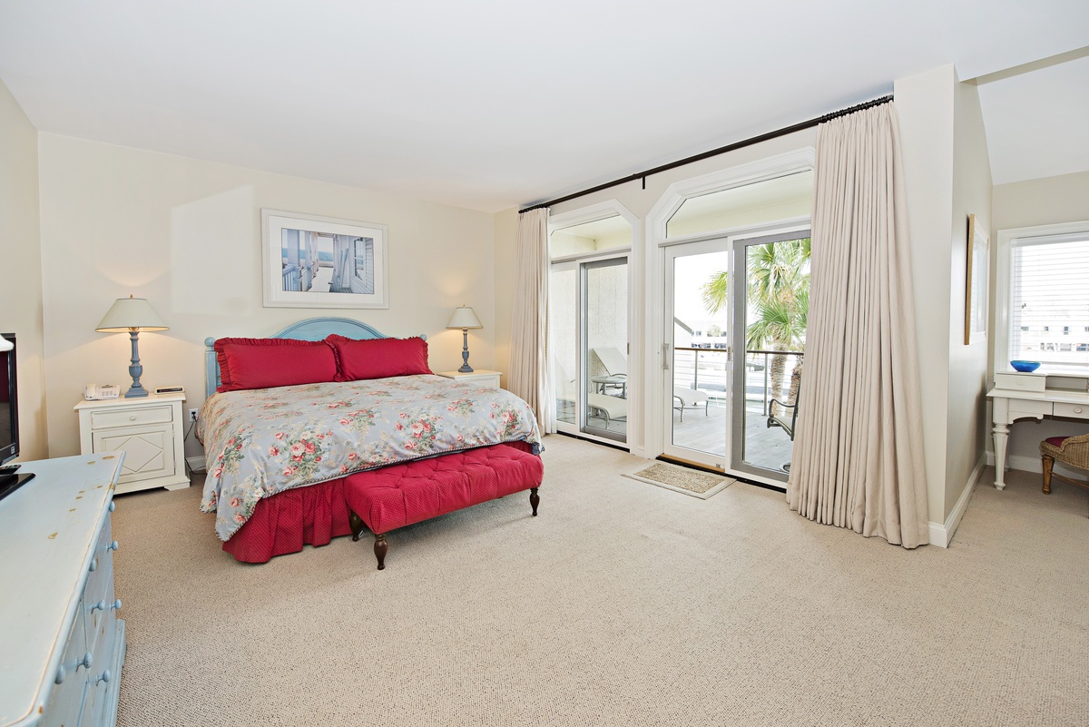 Then, on the top floor is a spectacular master bedroom with vaulted ceilings and a panoramic bird’s eye view of Harbour Town and the waters of Calibogue Sound beyond. The room also features a king-sized bed covered in a pale blue spread, plus there’s a TV, and spa-like private bath with corner tub, double vanity and walk-in shower. From this bedroom, there is a magnificent deck through sliding glass doors whose view completely captivates from this vantage point.