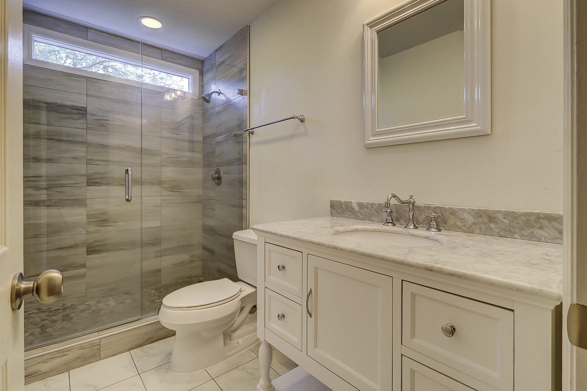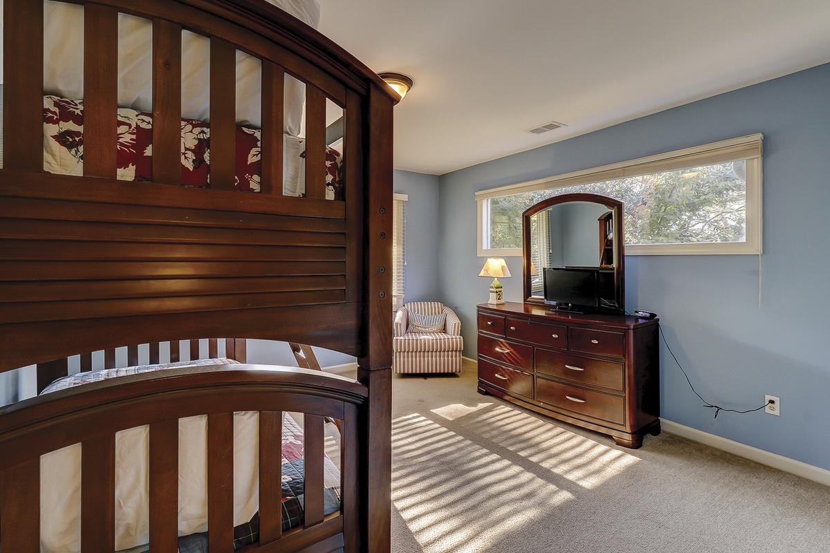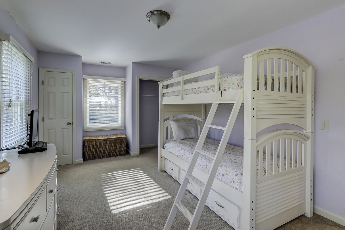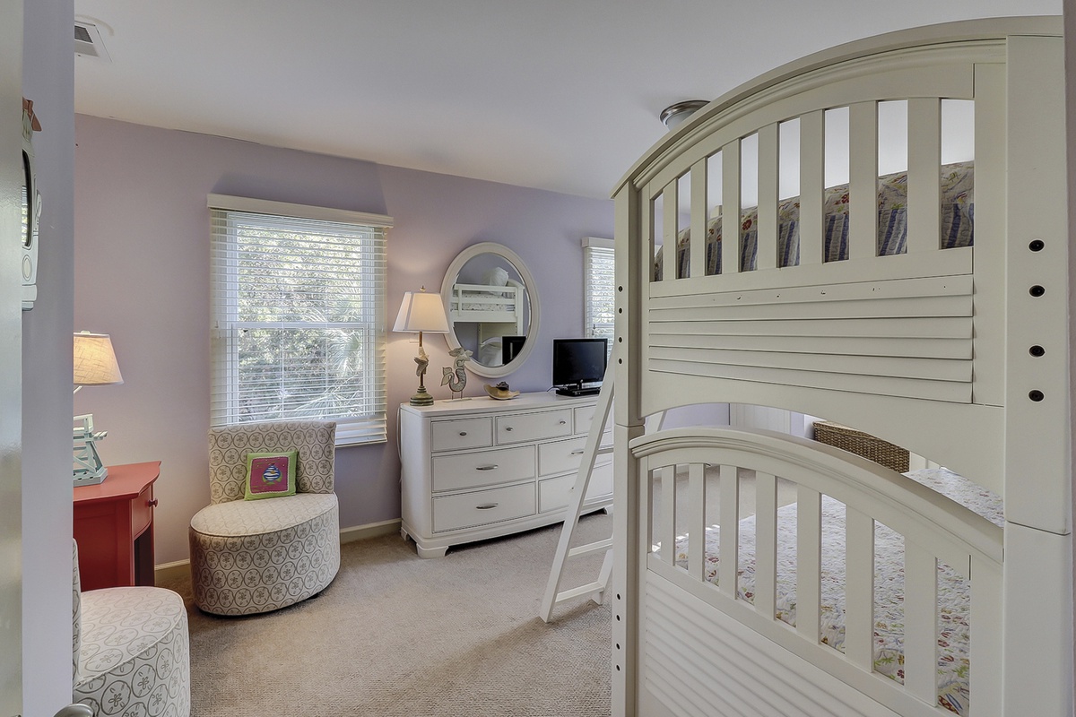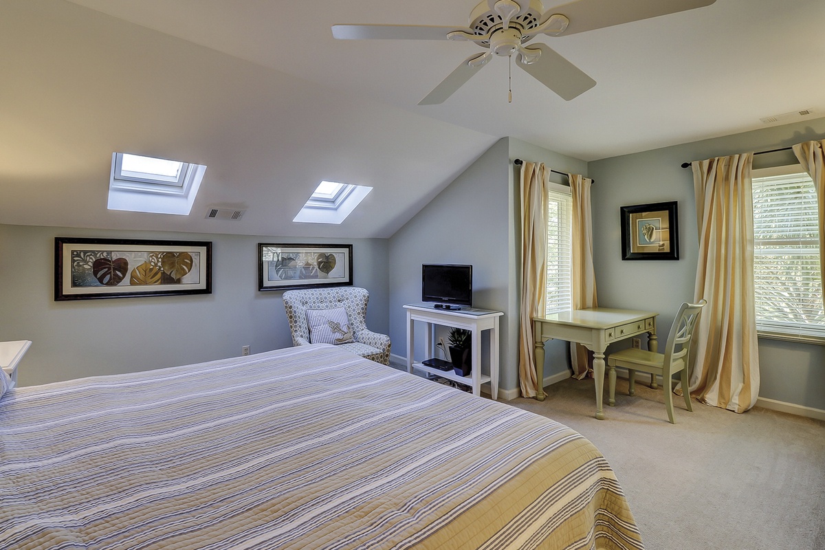 Downstairs, we find three more guest rooms. The first welcomes you in through an architecturally unique skylit foyer, a day bed with trundle and a flat-screen TV flanking an enormous bay window gazing out on marsh views, and a private bath boasting walk-in shower.