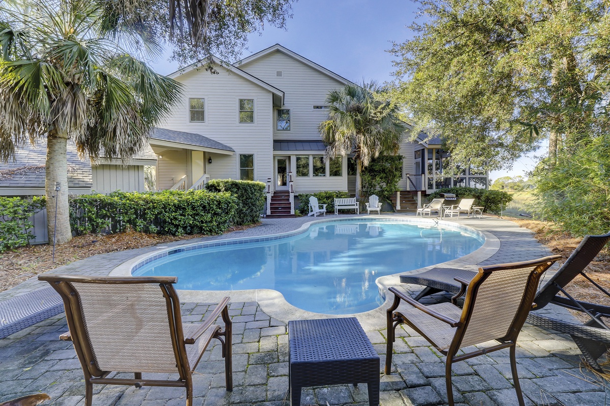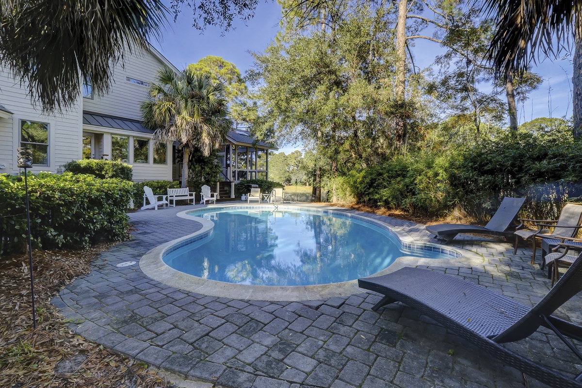 While the inside might offer entertainment delight, it’s the outdoor living spaces that truly give the whole group a place to play. Enjoys the sun-dappled brilliance of the sprawling paver patio to one side, encircling a resort-style swimming pool and offering space for grilling, relaxing and unwinding. For a quiet evening, a screened-in lanai provides outdoor dining with mesmerizing marsh views.