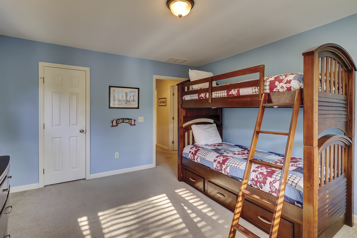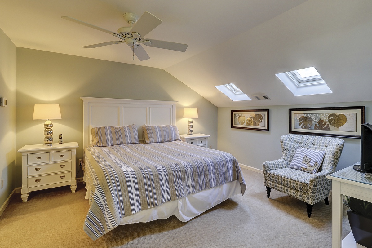 The comfort and elegance of this magnificent home finds beautiful expression among its six guest rooms. Three are located just up a set of stairs, which leads you to a spacious area drenched in natural light from soaring skylights. The first of the upstairs bedrooms enjoys a king-size bed, ceiling fan, flat-screen TV and en suite with walk-in shower amid spacious splendor. The other two are mirror-image bunk rooms that share a roomy full bath, where bunk beds and trundle beds offer plentiful sleeping options.