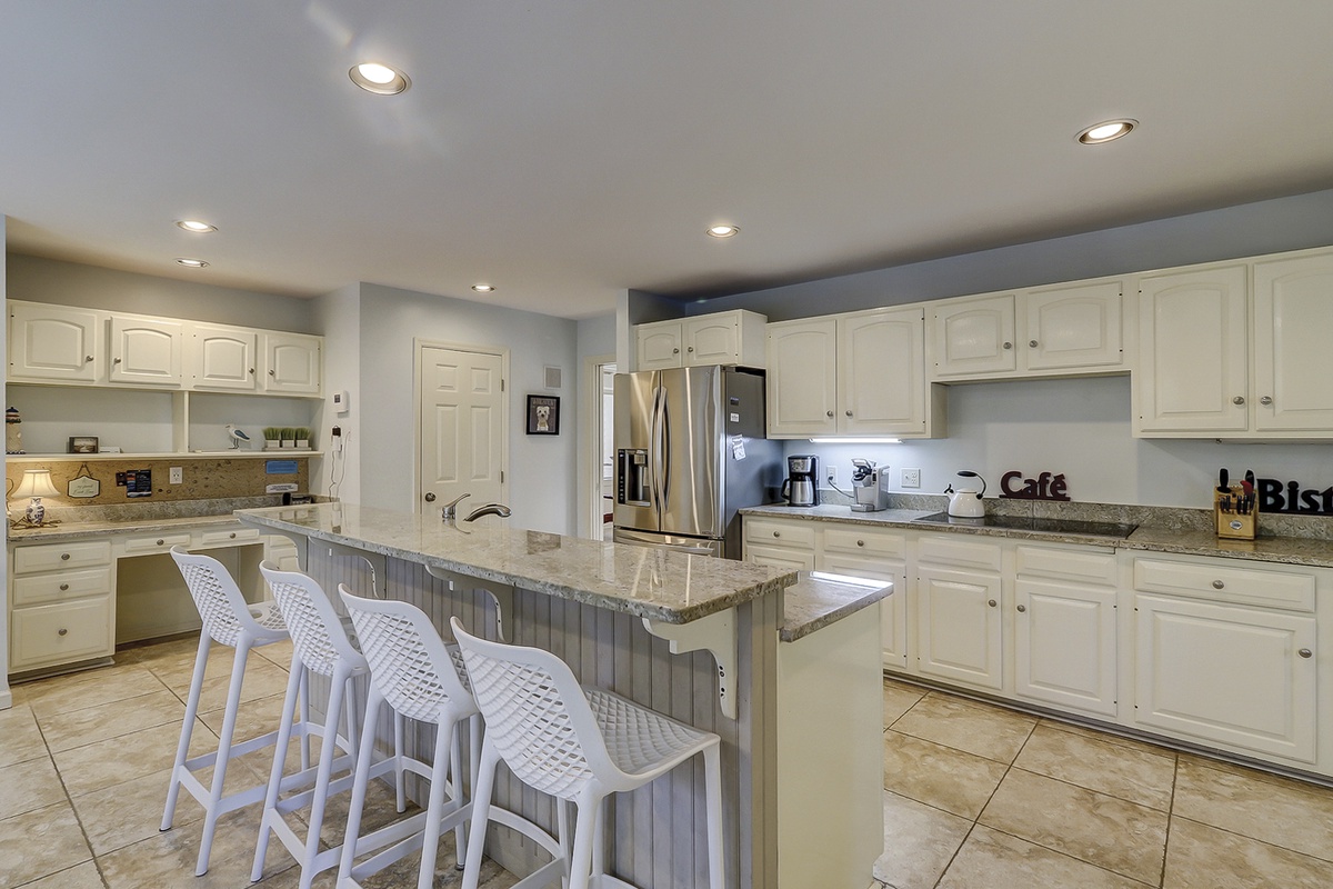 Just off the dining room, the exquisitely spacious kitchen enjoys upgraded appliances and coastal inspired style, with a spacious center island and dine-in seating allowing the whole party to enjoy a meal prepared on state-of-the-art appliances. A nearby washer and dryer enjoys a second refrigerator for keeping the party going, while a quiet den with flat-screen TV further down offers a spot for more intimate get togethers.