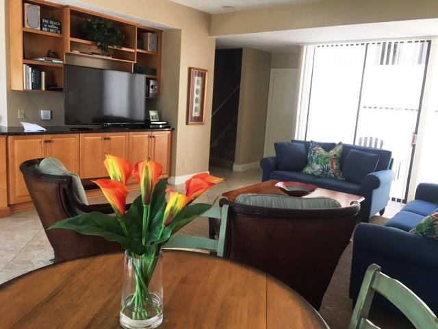 A saturnia foyer and graceful living room reveal the villa’s elegance upon entry. The living room, which includes a sofa, is open and airy with green and slate blue furnishings contrasted against neutral hues in furnishings and walls. A round glass-top table for four is in the living room as well, ideal for game-playing. A large flat screen TV sits atop a granite countertop that continues around the corner to the kitchen which features a flat cooktop, the same lovely black granite counters and oil-rubbed bronze pulls on the sleek cabinetry.